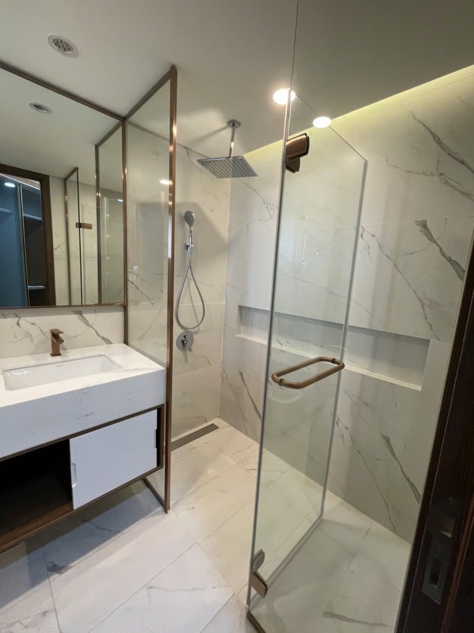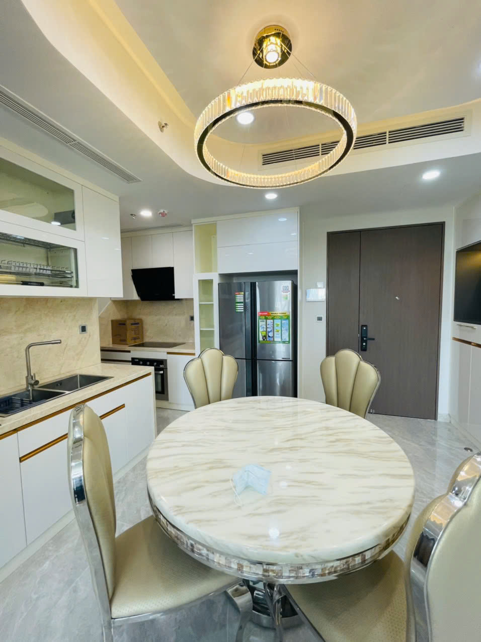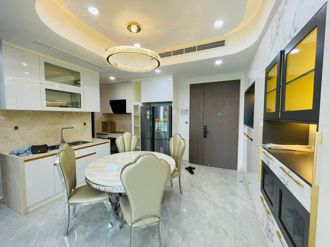 Khu vực bếp được thiết kế liền mạch với phòng ăn, trang bị đầy đủ nội thất và thiết bị hiện đại, hệ tủ âm tường, mặt đá cao cấp, tiện lợi cho sinh hoạt hằng ngày cũng như tiếp khách. Nội thất trong căn hộ được chọn lọc kỹ, phong cách thanh lịch – sang trọng, phù hợp với cả khách ở lâu dài lẫn khách thuê cao cấp.