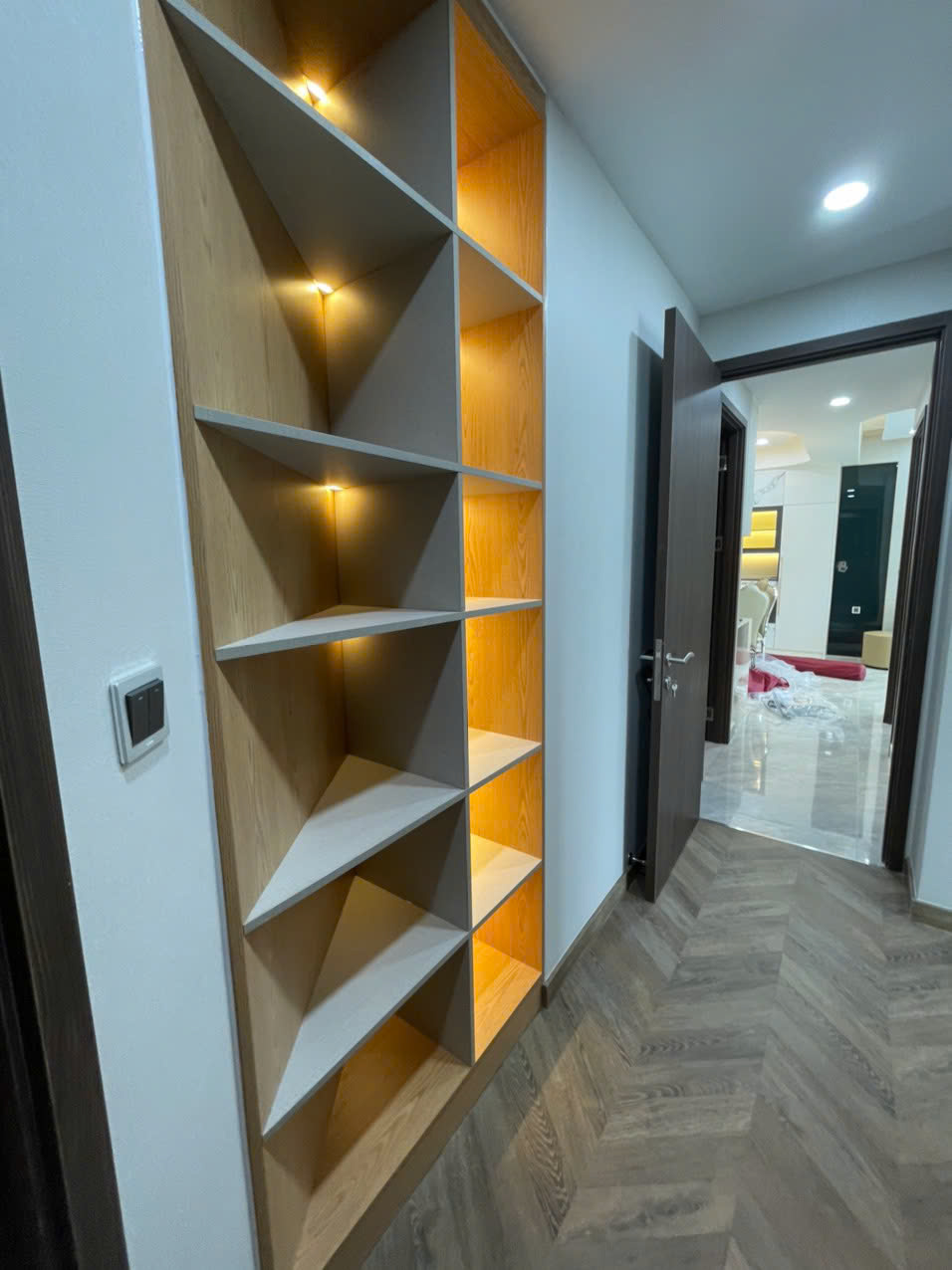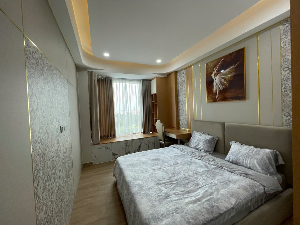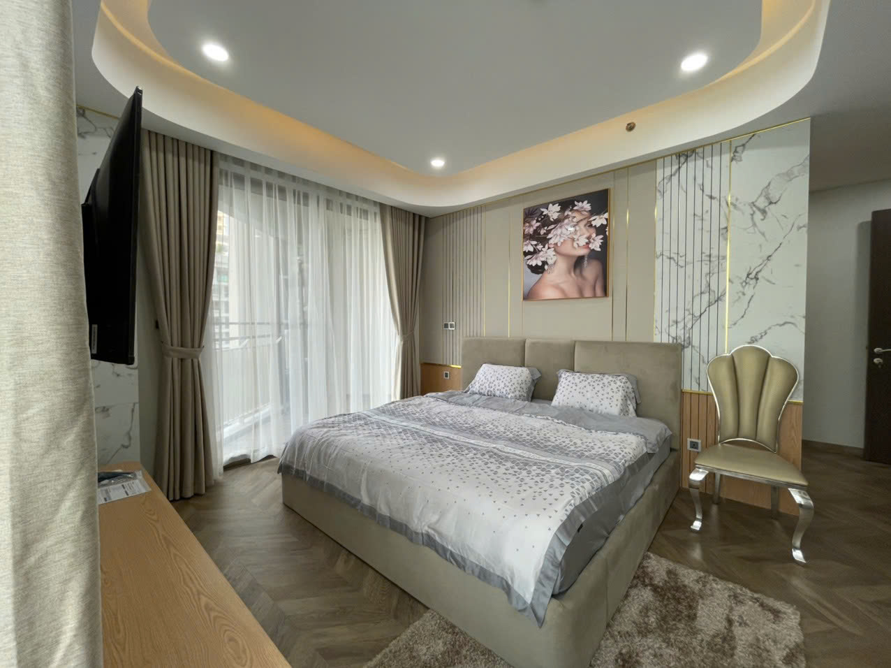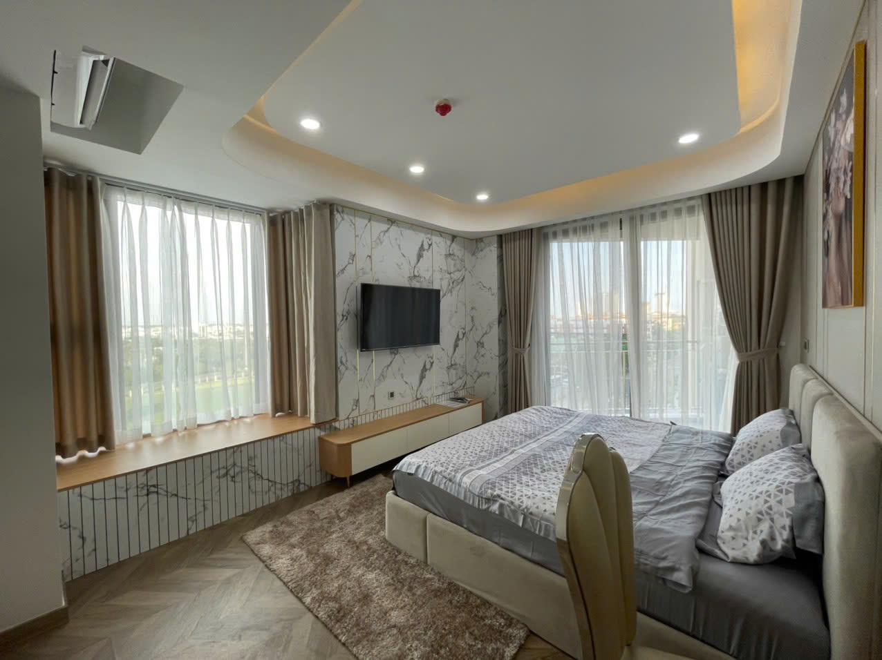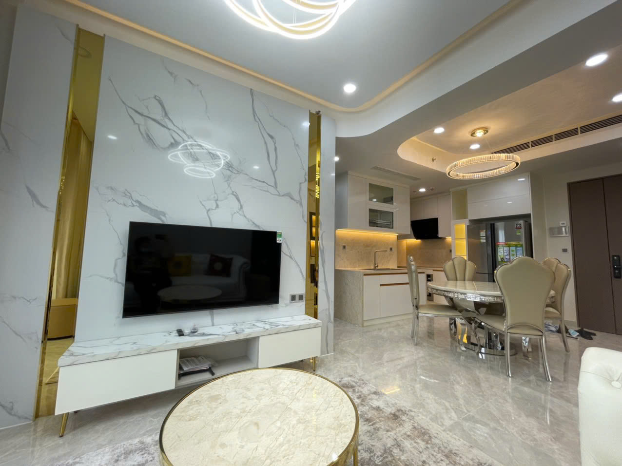 Căn hộ có diện tích lớn 98m², thiết kế 2 phòng ngủ rộng rãi, bố cục thông minh giúp tối ưu không gian sinh hoạt. Phòng khách thoáng sáng, trần cao, kết hợp hệ đèn trang trí sang trọng và cửa sổ lớn, mang lại cảm giác dễ chịu và đẳng cấp.