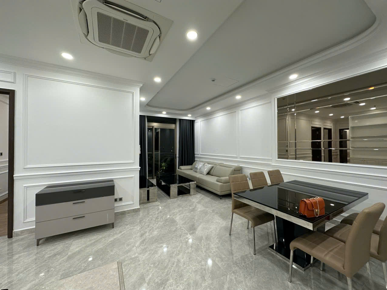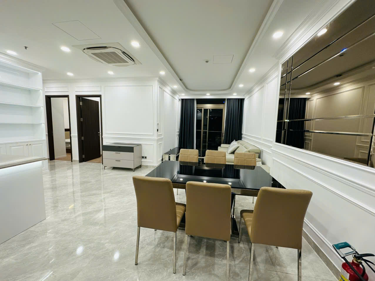 Sở hữu diện tích 124m², căn hộ được thiết kế 3 phòng ngủ với bố cục hợp lý, tạo cảm giác rộng rãi và dễ chịu. Không gian sinh hoạt chung được mở rộng tối đa khi phòng khách kết nối liền mạch với khu bếp và bàn ăn, mang lại sự tiện nghi trong sinh hoạt hằng ngày.