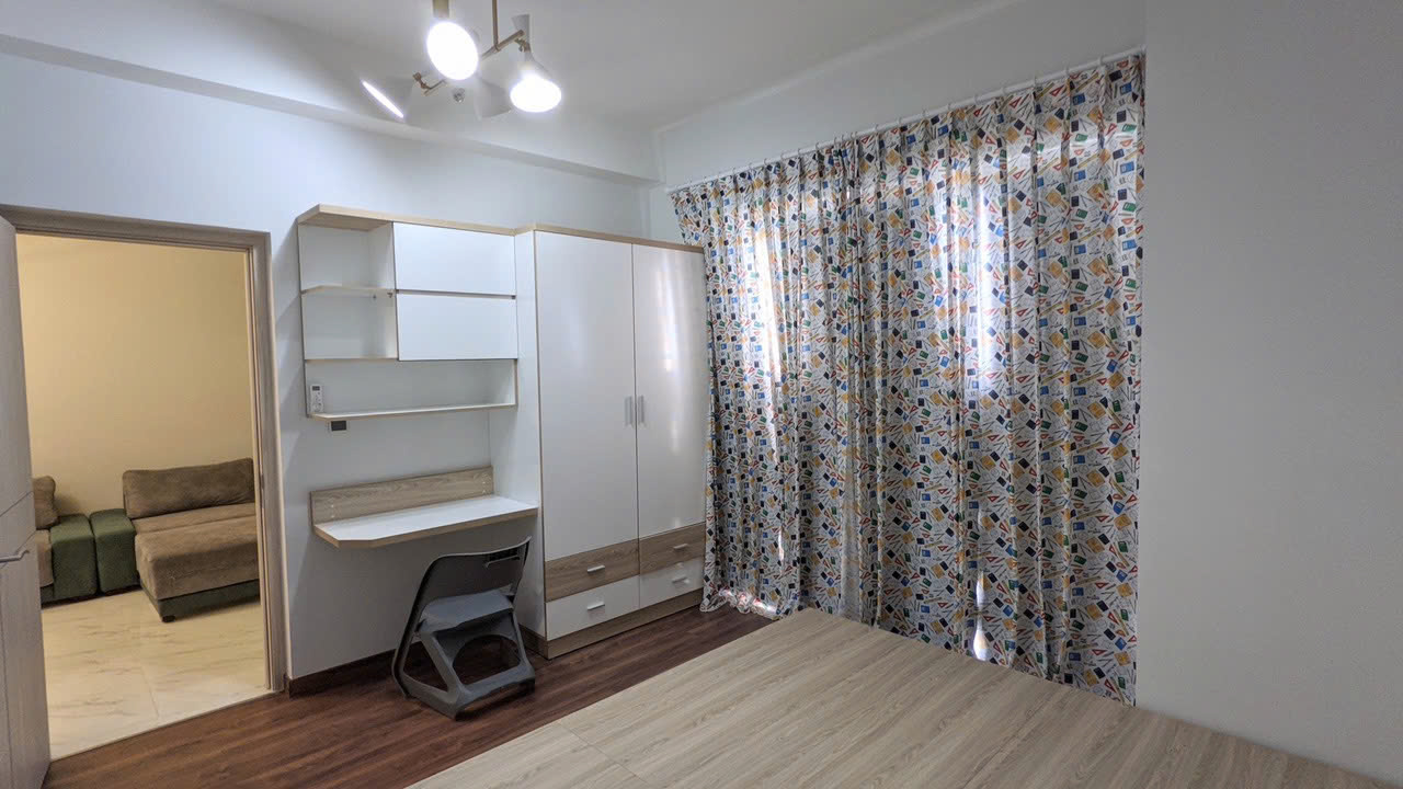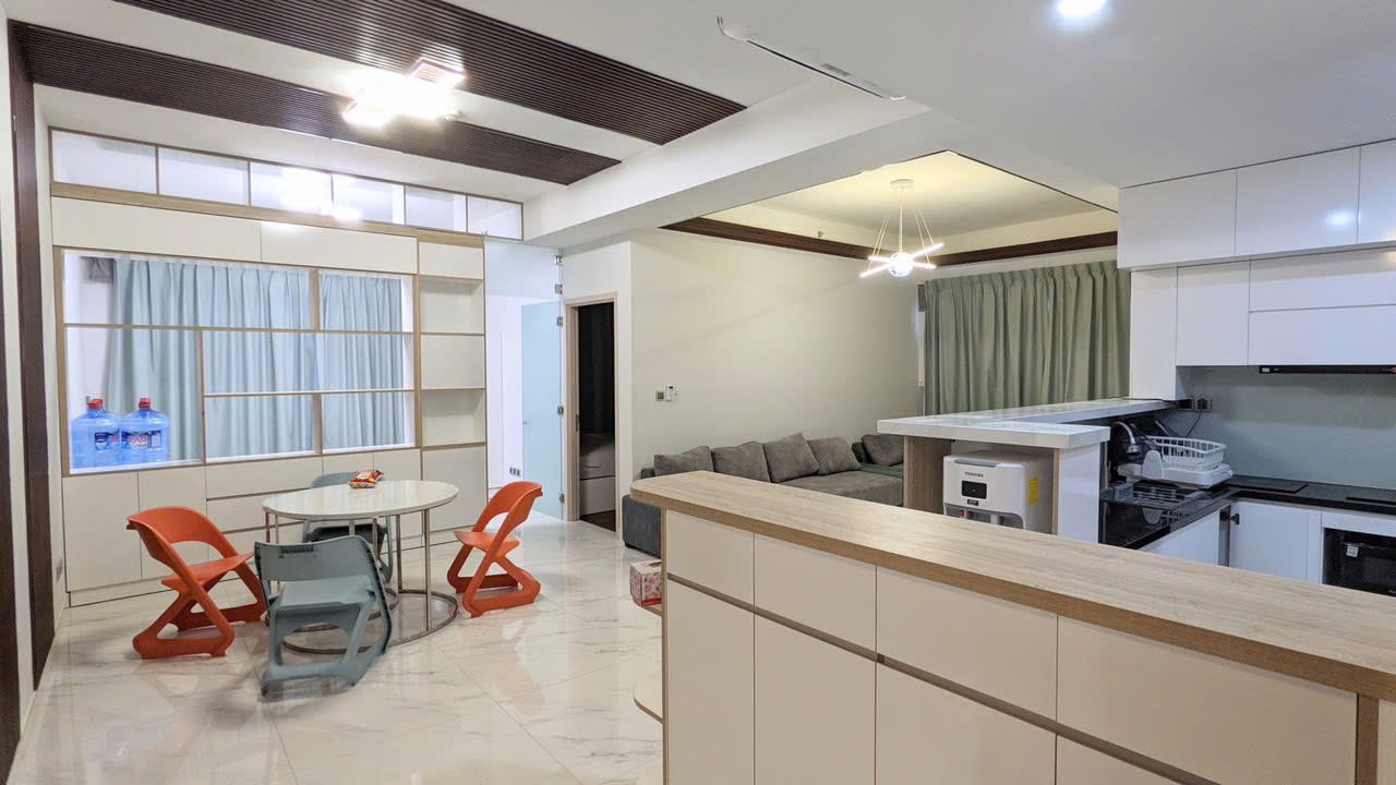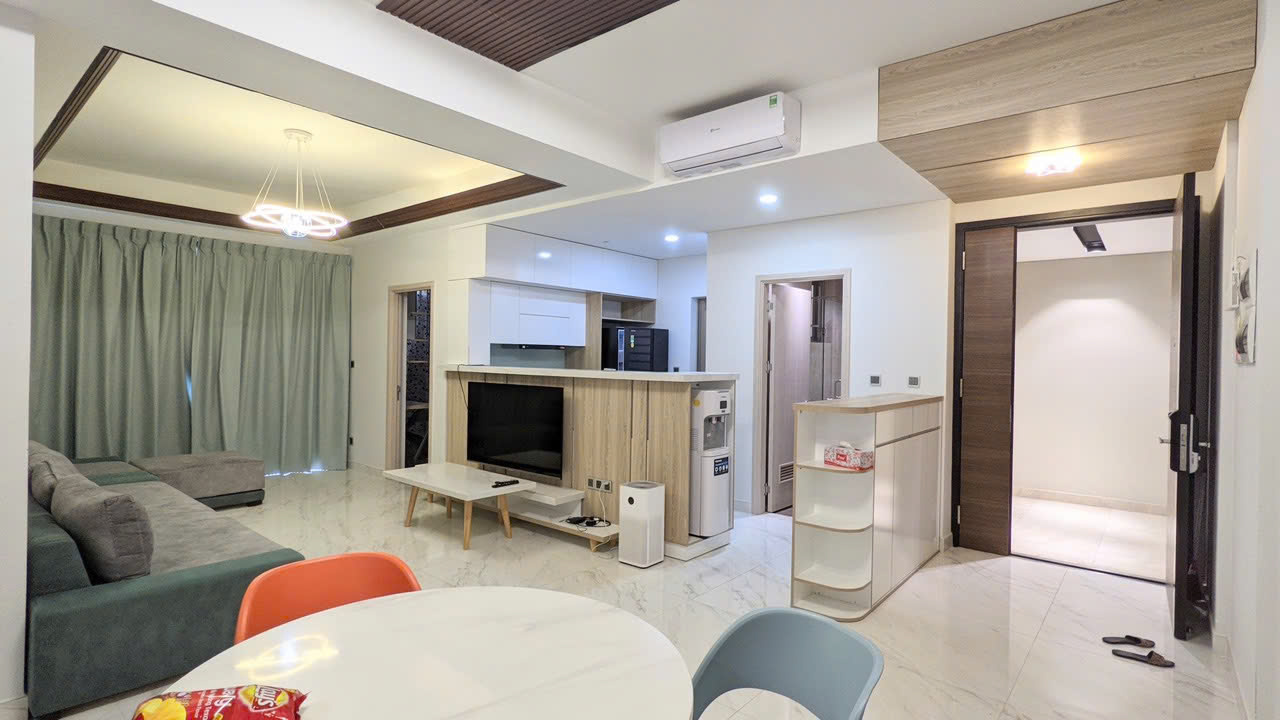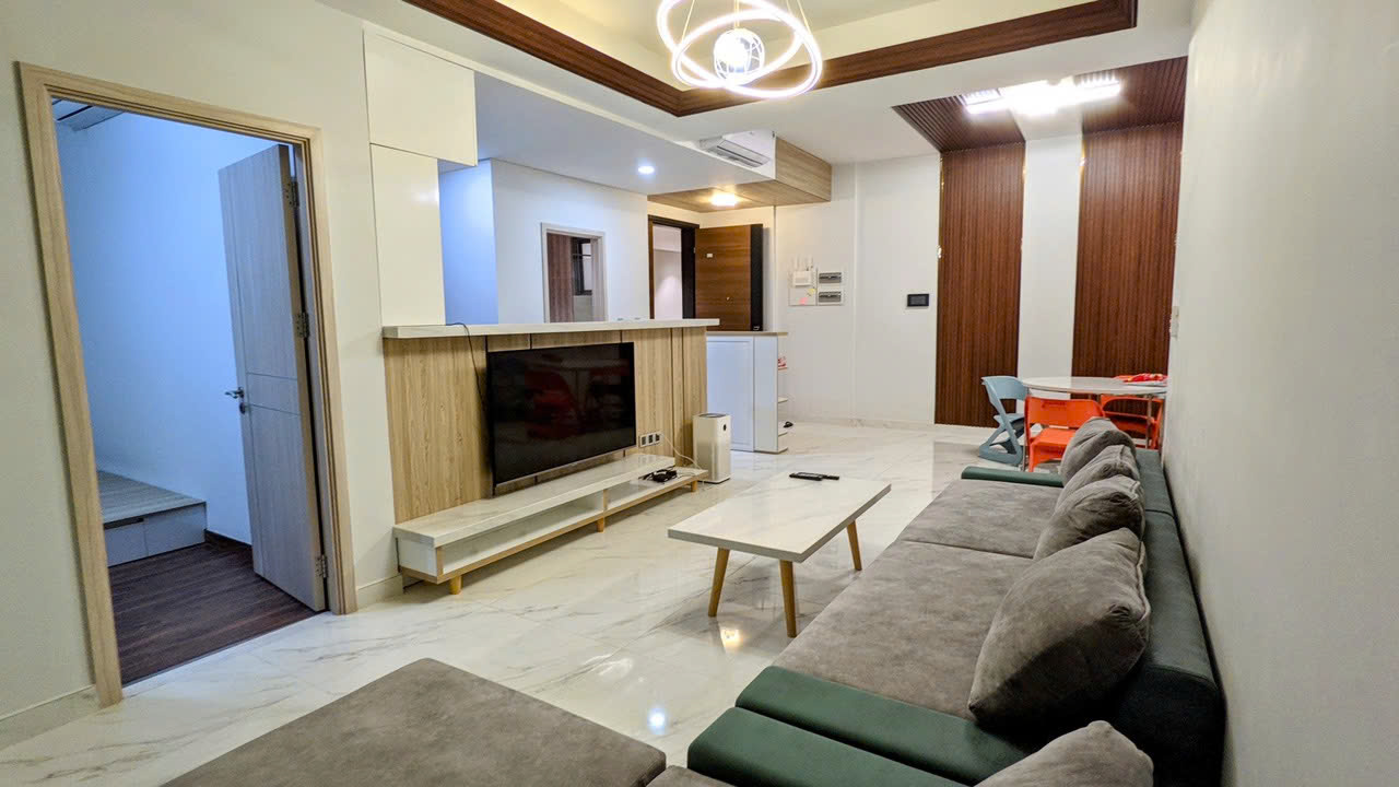 Căn hộ có diện tích 110m², thiết kế 3 phòng ngủ, 2 phòng vệ sinh với bố cục hợp lý. Phòng khách rộng rãi kết nối khu bếp và bàn ăn, mang lại không gian sinh hoạt thoải mái. Nội thất được trang bị đầy đủ theo phong cách hiện đại, có thể vào ở ngay hoặc khai thác cho thuê.