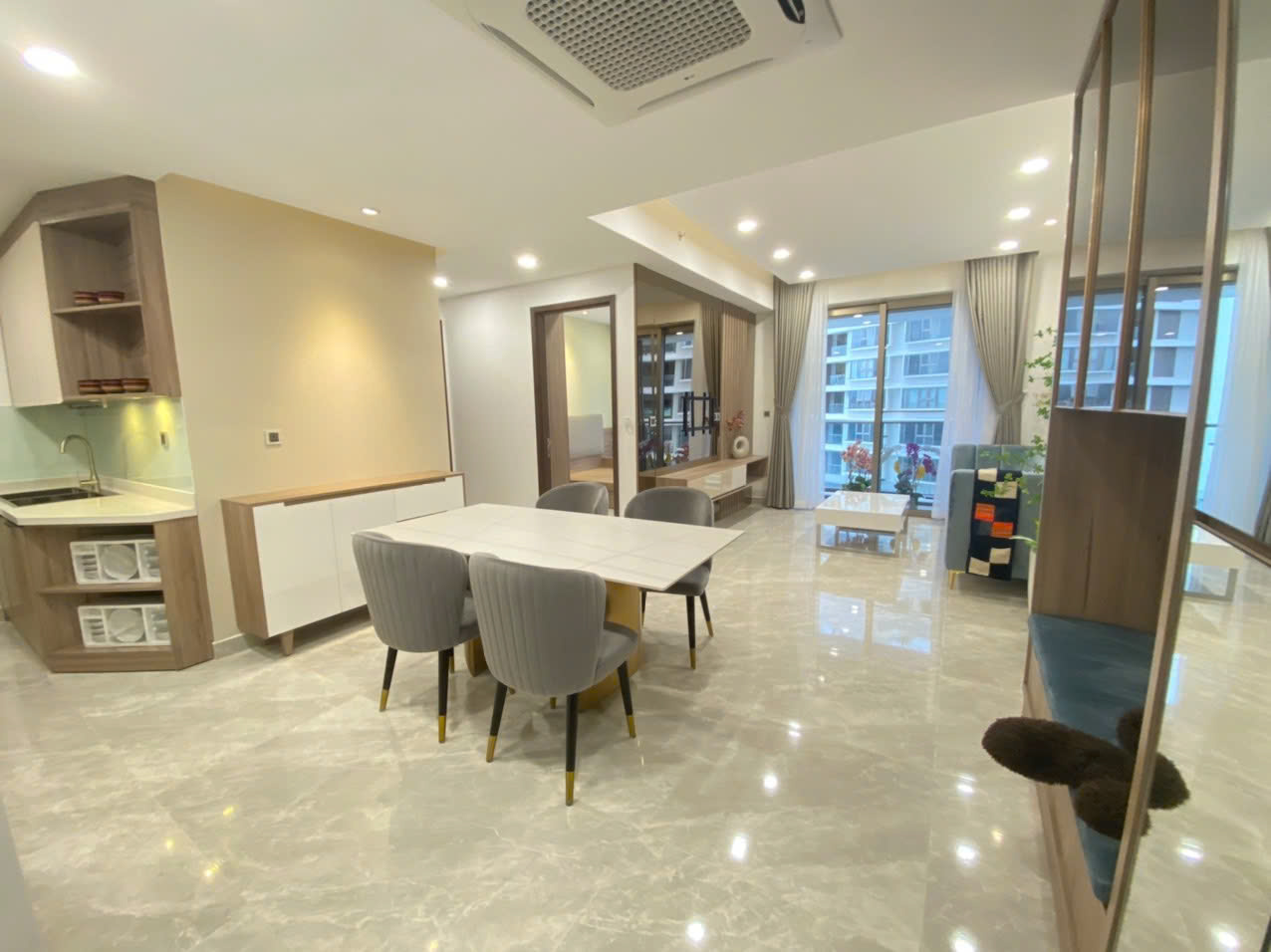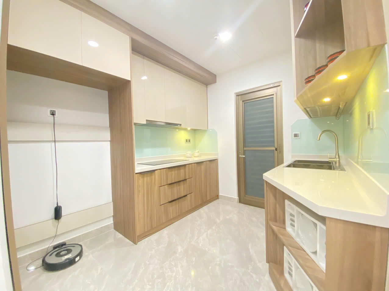 Khu bếp được thiết kế liền mạch với phòng khách tối ưu diện tích sử dụng Nội thất trang bị đầy đủ với tông màu sáng hiện đại phù hợp cho khách thuê chỉ cần xách vali vào ở ngay