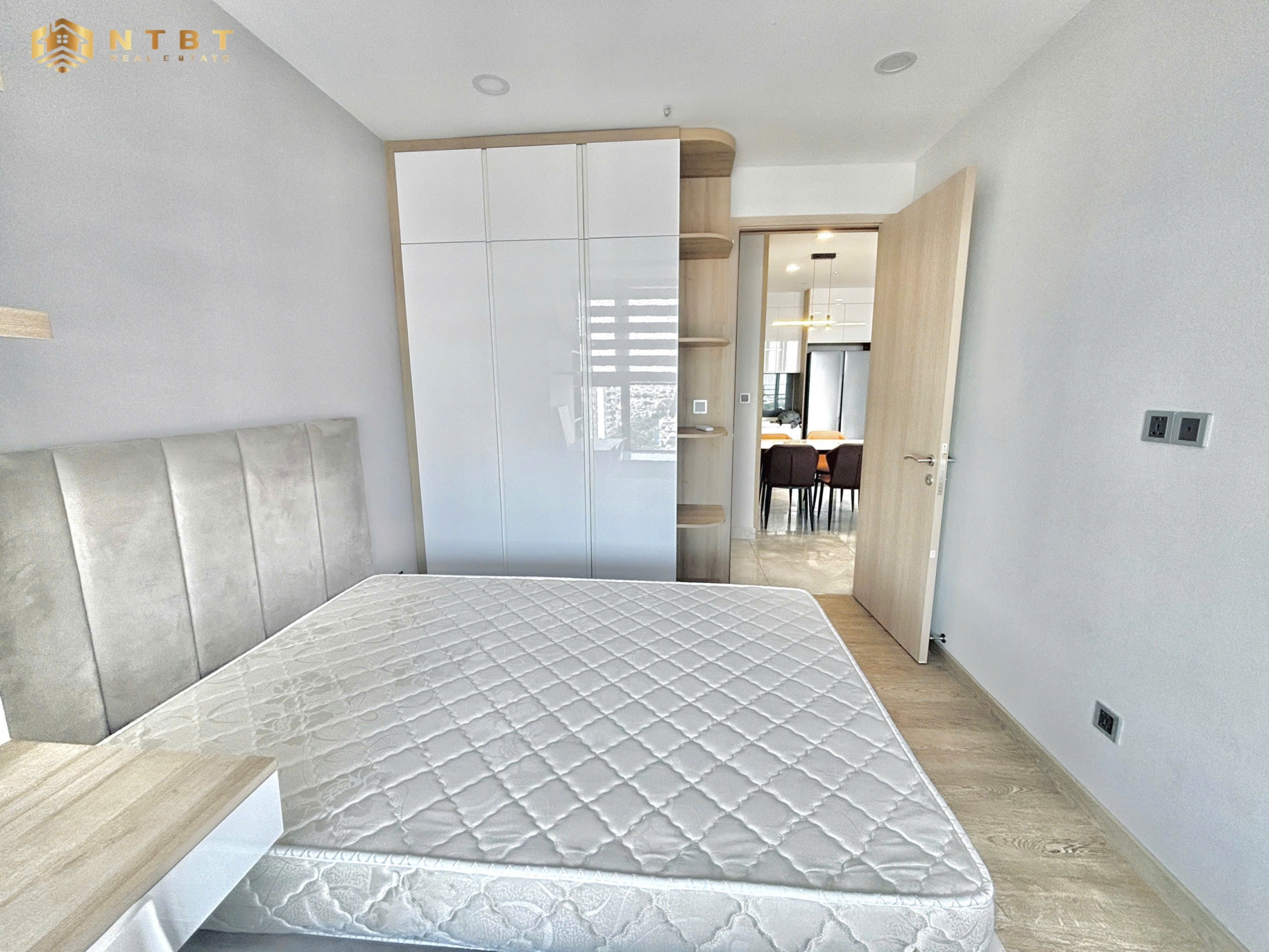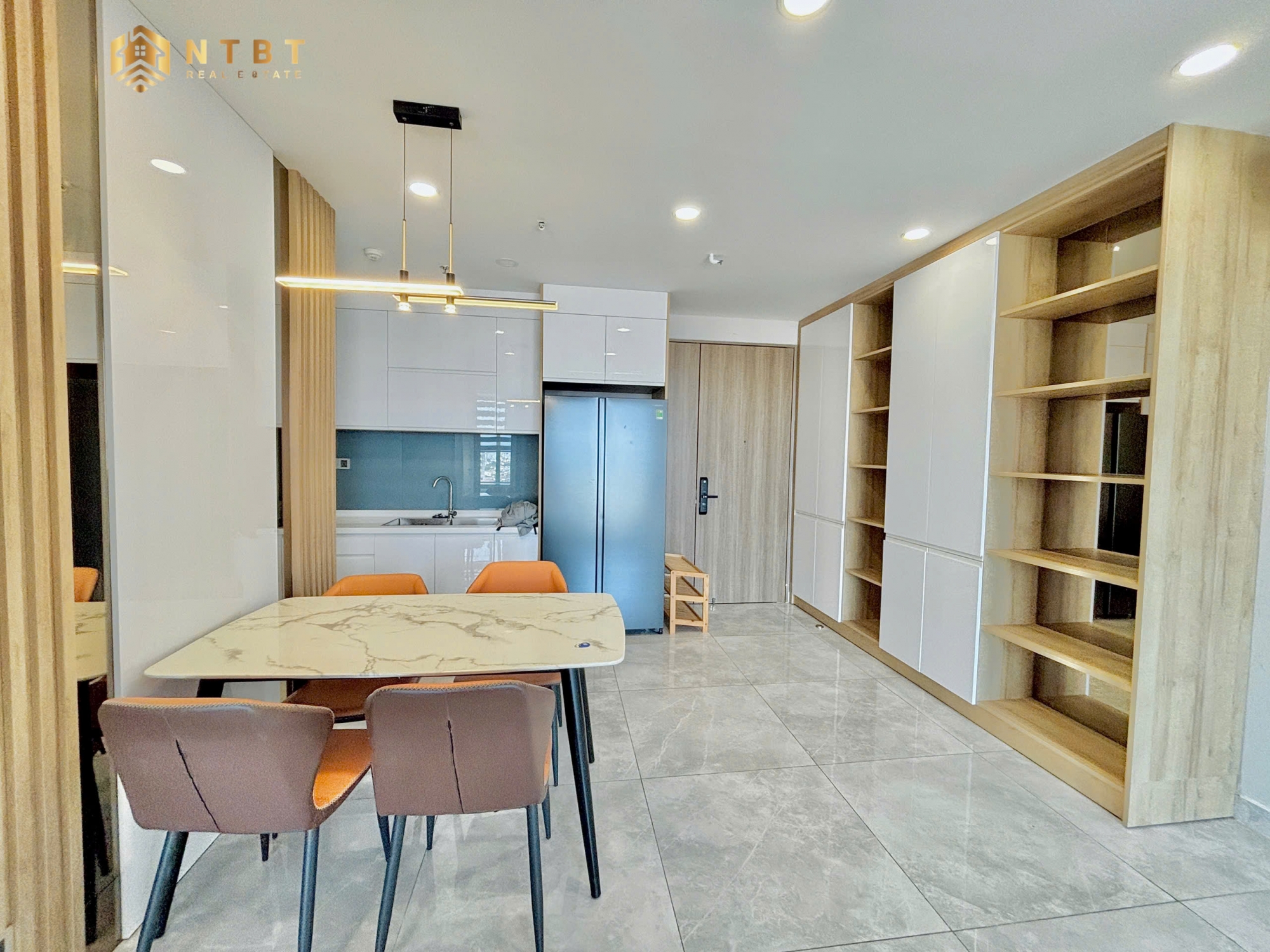 Căn hộ được thiết kế theo phong cách hiện đại – tinh tế, gam màu sáng kết hợp nội thất gỗ sang trọng tạo cảm giác ấm cúng nhưng vẫn rất thoáng đãng. Phòng khách rộng rãi, liên thông với khu bếp và bàn ăn, phù hợp cho sinh hoạt gia đình hoặc tiếp khách.
