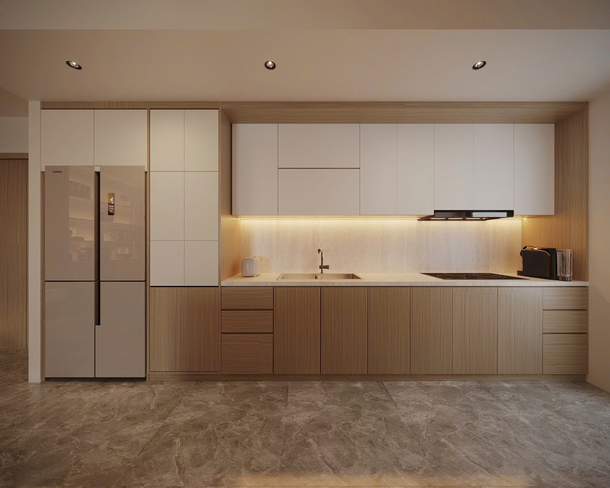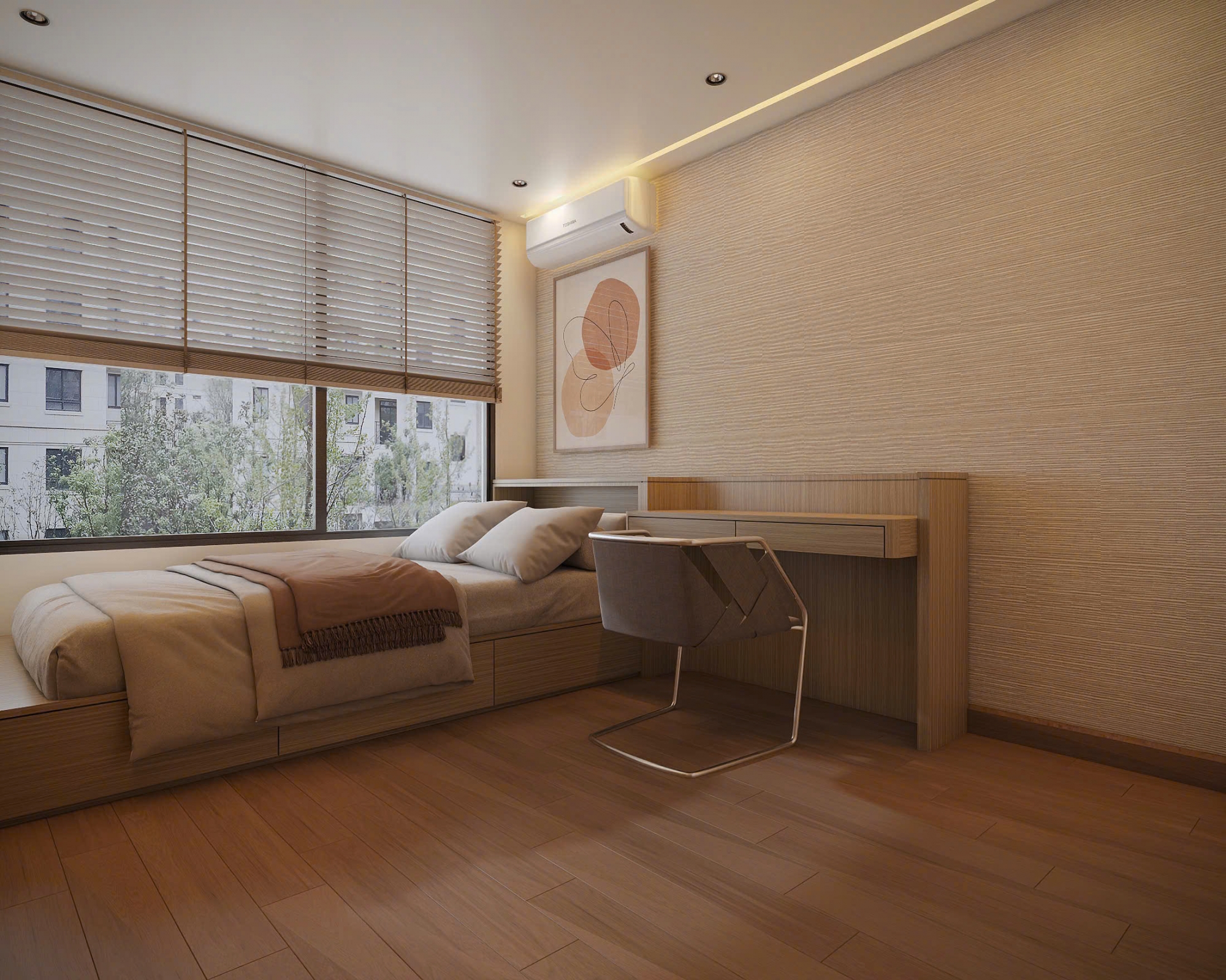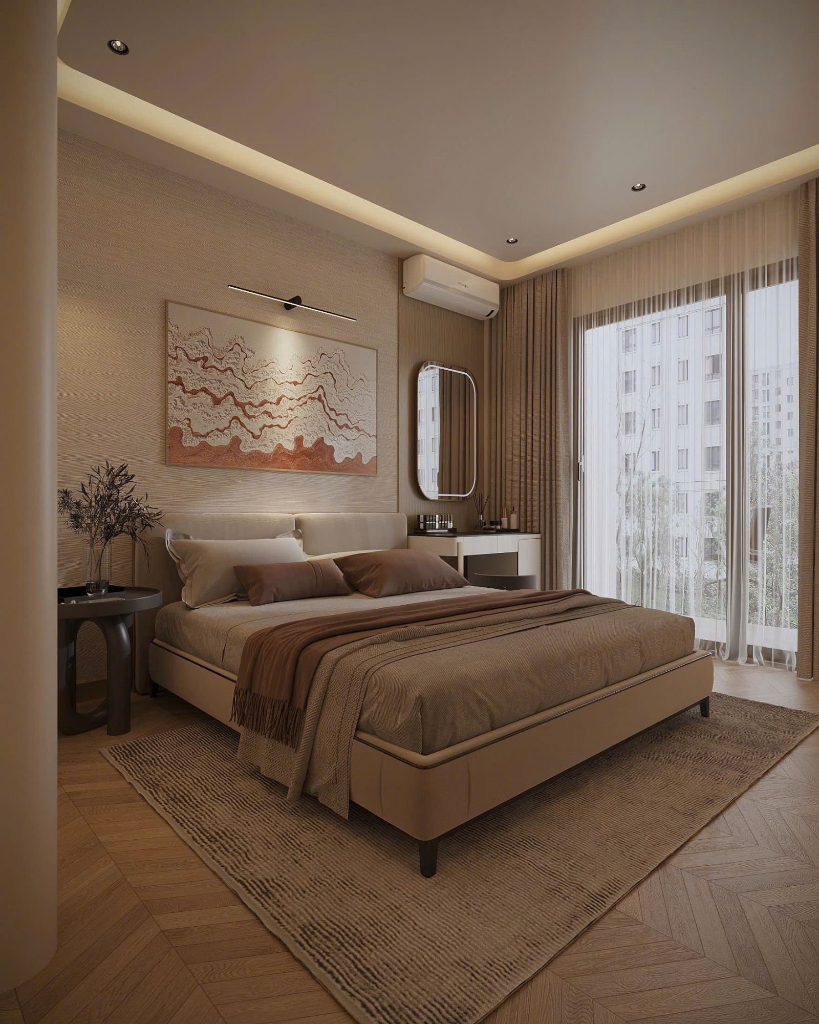 Không gian nội thất được đầu tư hoàn toàn mới, sử dụng vật liệu cao cấp, gam màu trung tính thanh lịch, tạo cảm giác ấm cúng nhưng vẫn rất sang trọng. Phòng khách rộng rãi, kết nối hài hòa với khu vực bếp và bàn ăn, mang đến sự thông thoáng và tiện nghi trong sinh hoạt hằng ngày. Hệ cửa kính lớn giúp căn hộ luôn tràn ngập ánh sáng tự nhiên.