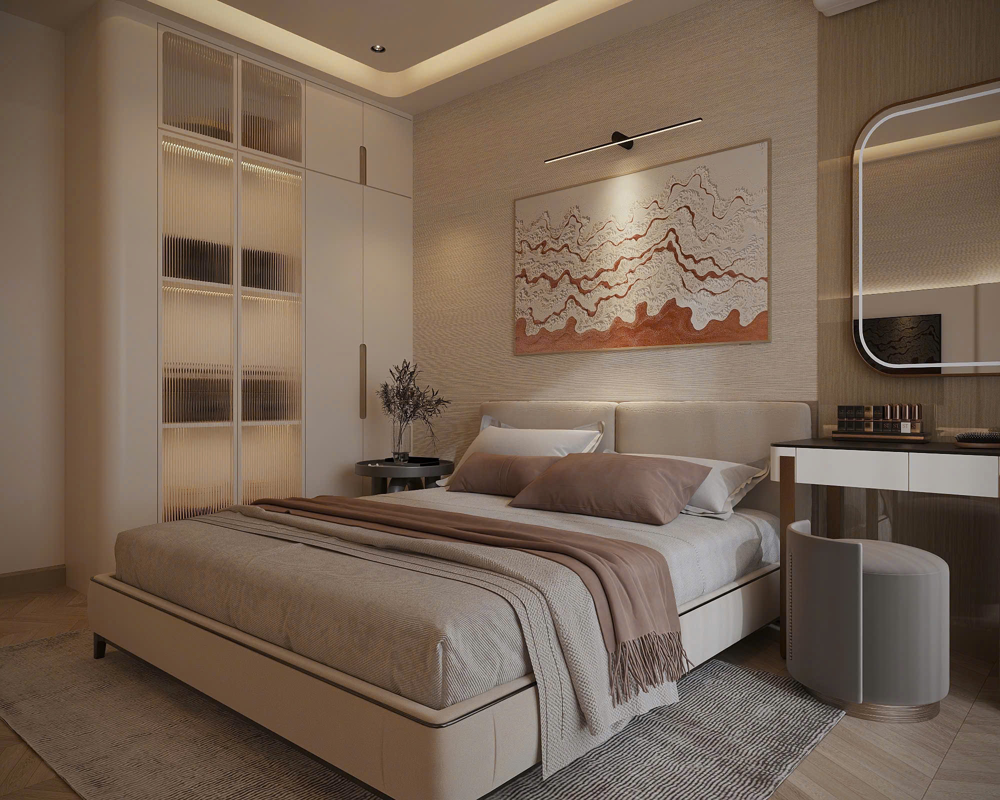 Căn hộ gồm 3 phòng ngủ riêng biệt, trong đó phòng ngủ master rộng rãi với nhà vệ sinh khép kín. Các phòng đều được trang bị đầy đủ giường, tủ, máy lạnh và rèm cửa cao cấp. Khu bếp hiện đại với đầy đủ thiết bị điện tử, phù hợp cho khách thuê ở lâu dài.