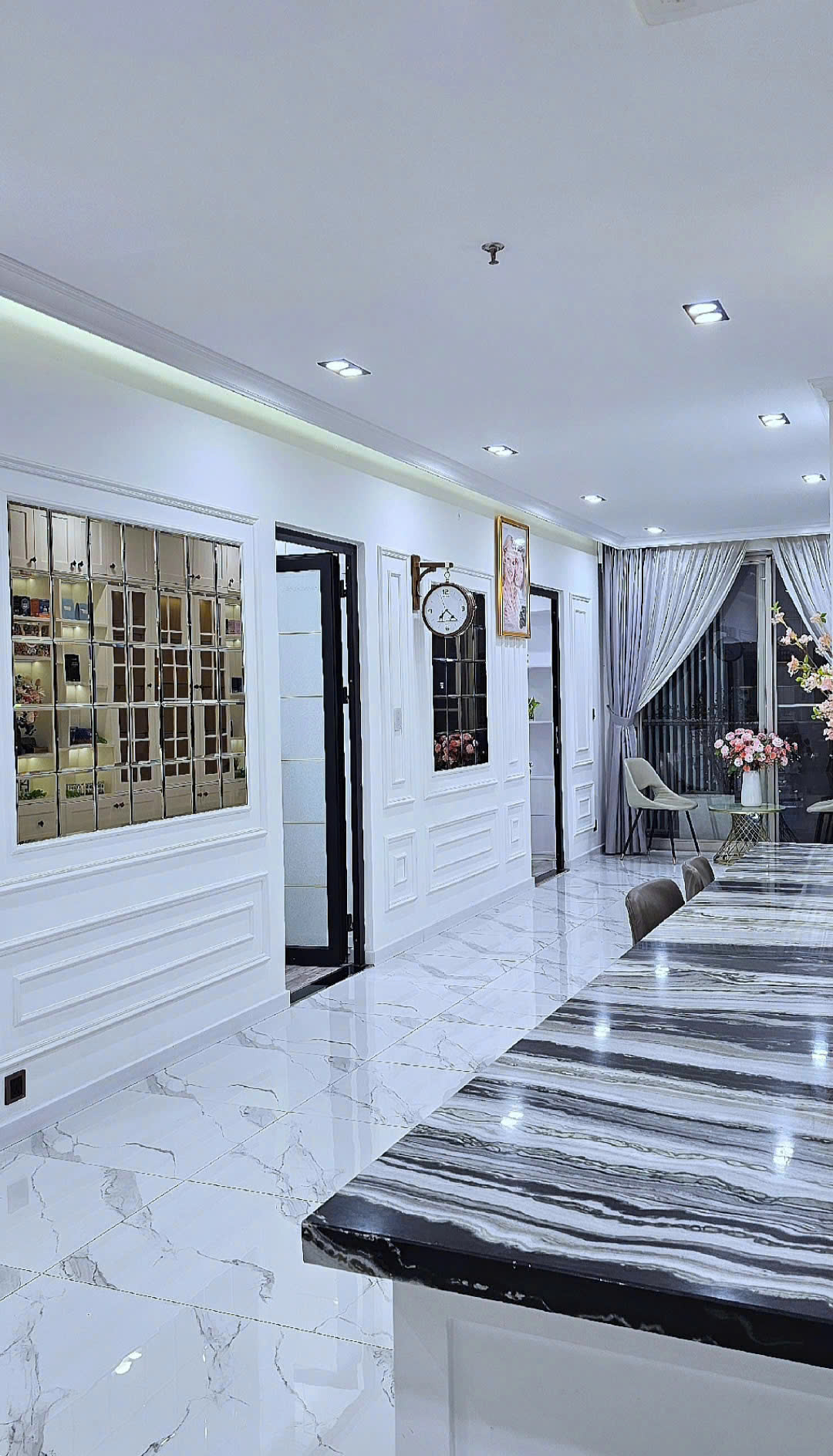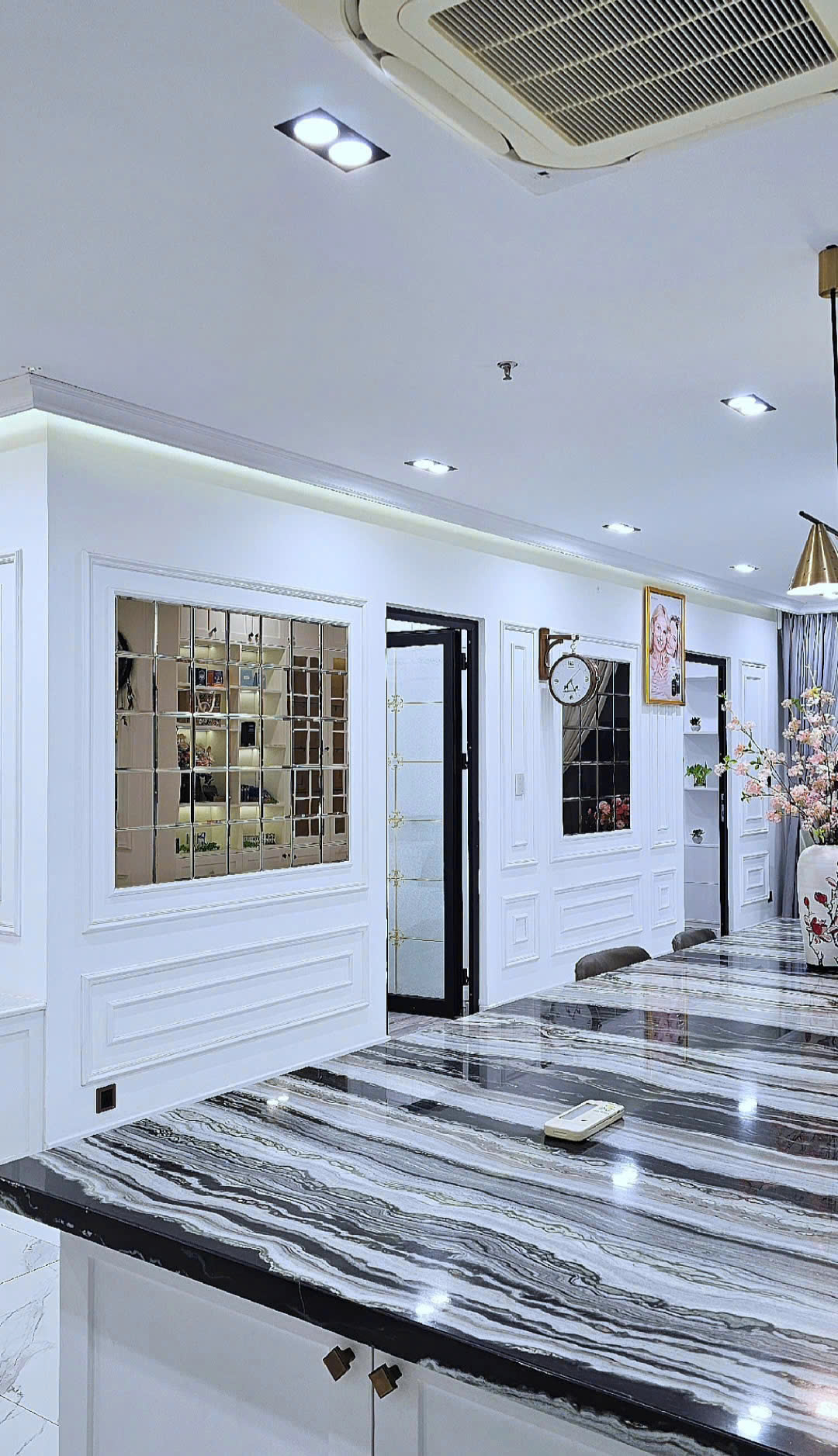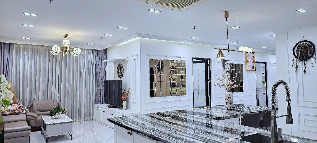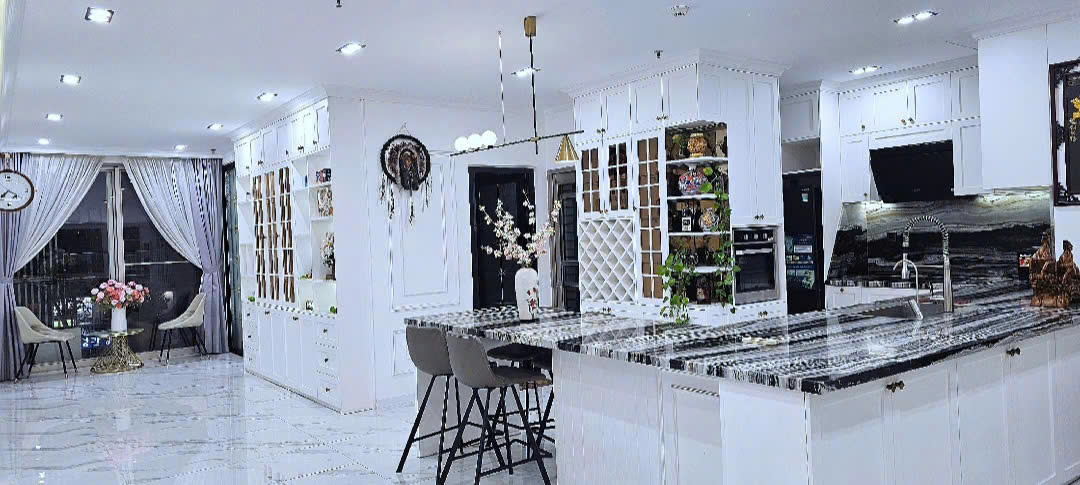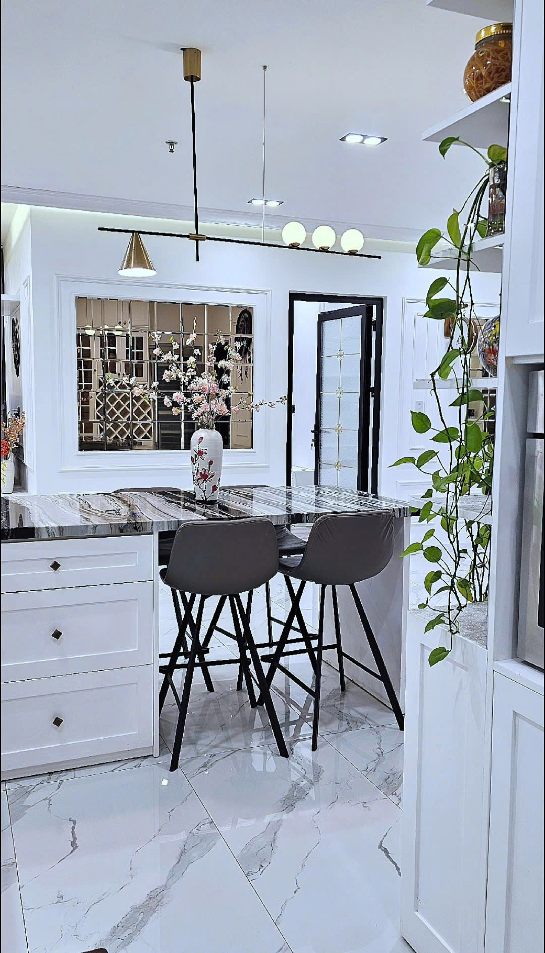 Khu bếp được thiết kế liền mạch với phòng ăn, trang bị đầy đủ nội thất và thiết bị hiện đại, tủ bếp lớn, mặt đá cao cấp, tiện nghi cho sinh hoạt hằng ngày. Nội thất tổng thể mang phong cách thanh lịch, ấm cúng nhưng vẫn sang trọng, phù hợp với nhiều đối tượng khách thuê.