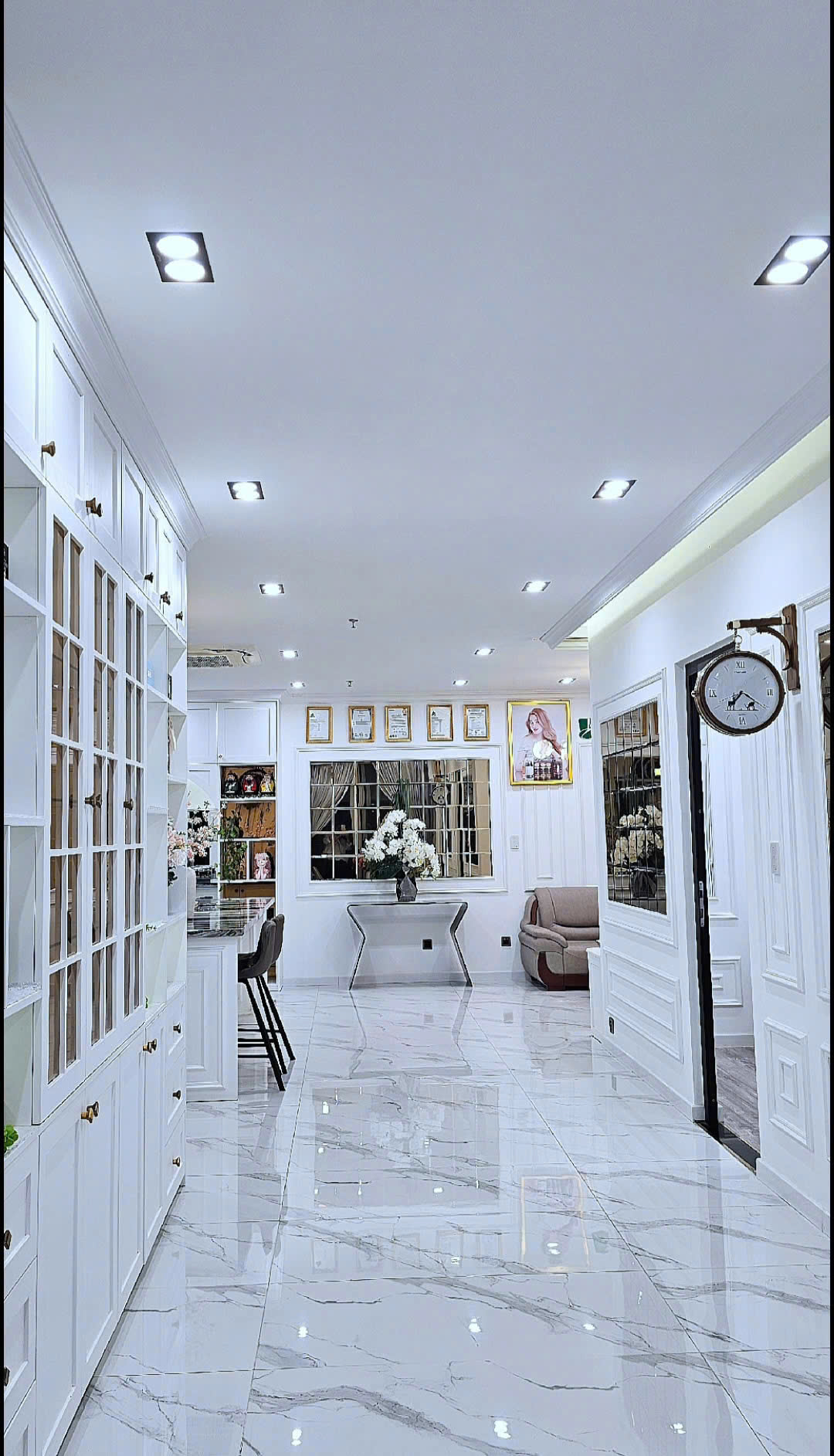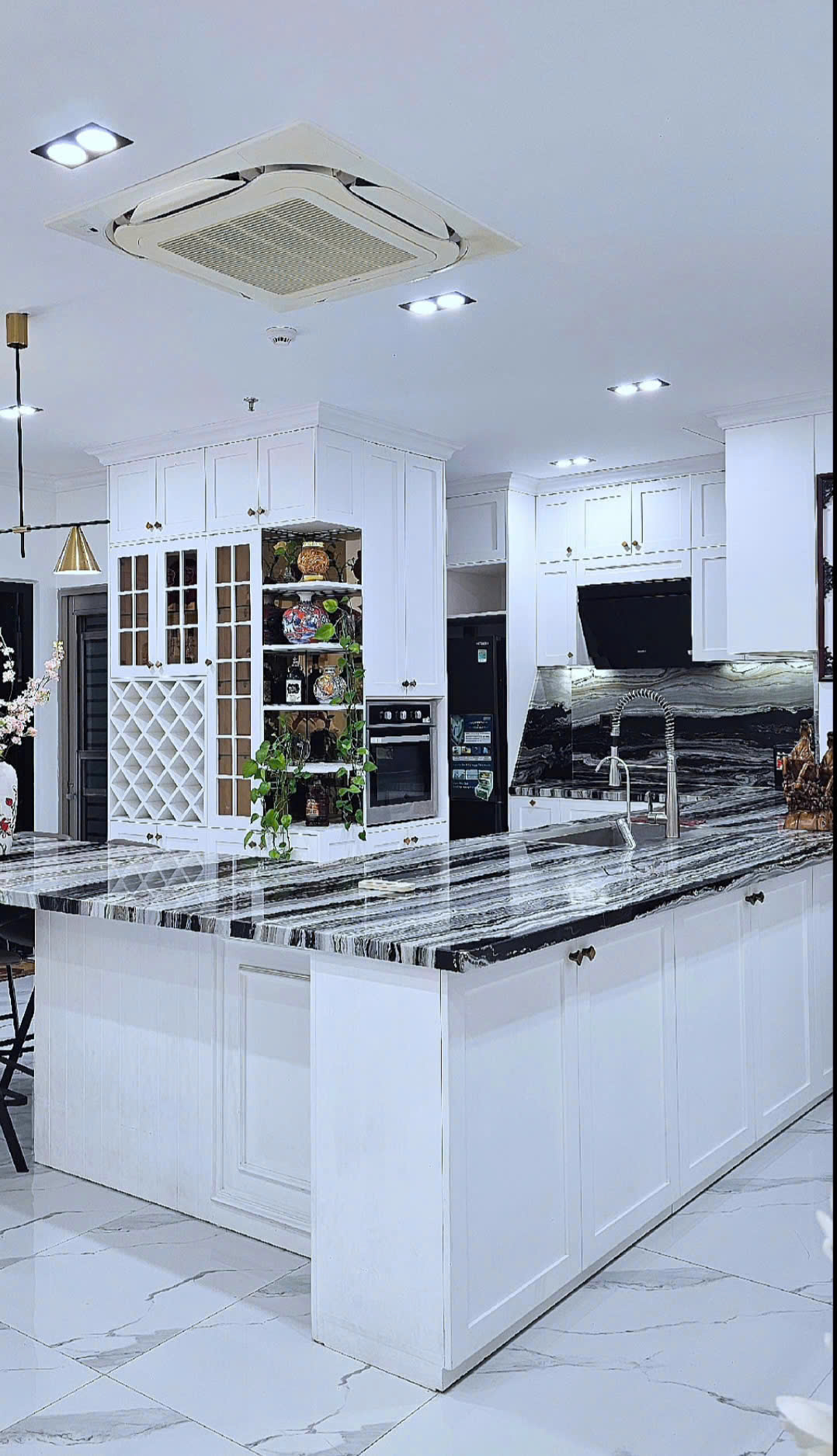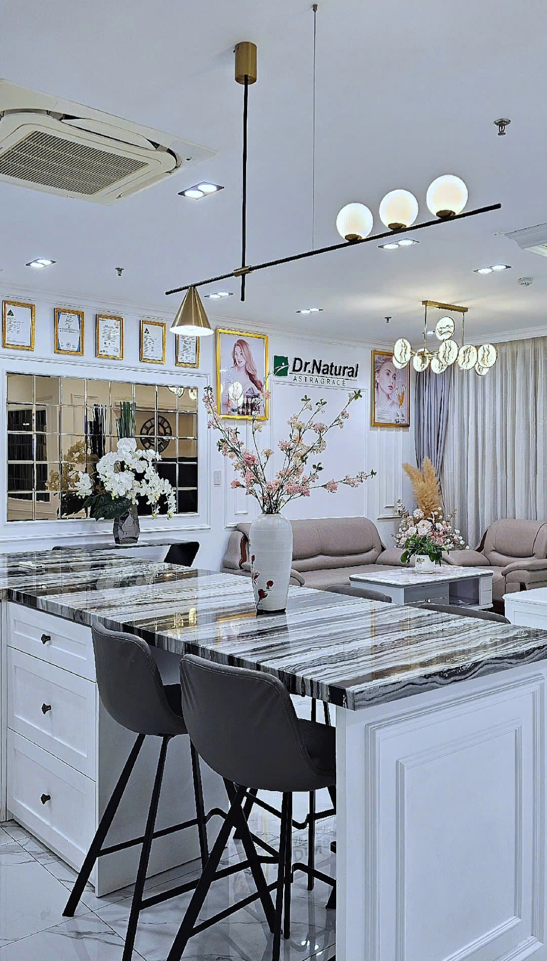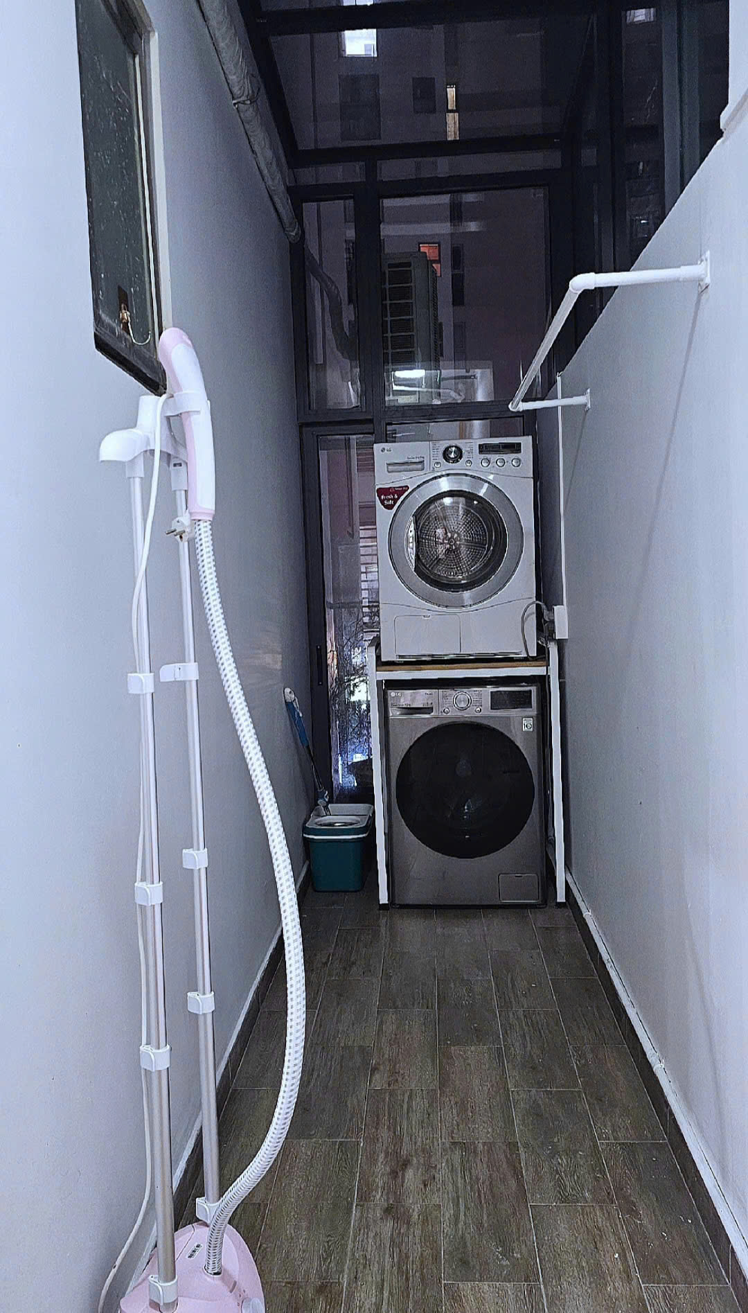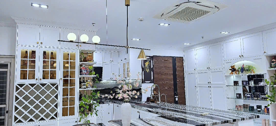 Khu bếp được thiết kế liền mạch với phòng ăn, trang bị đầy đủ nội thất và thiết bị hiện đại, tủ bếp lớn, mặt đá cao cấp, tiện nghi cho sinh hoạt hằng ngày. Nội thất tổng thể mang phong cách thanh lịch, ấm cúng nhưng vẫn sang trọng, phù hợp với nhiều đối tượng khách thuê.
