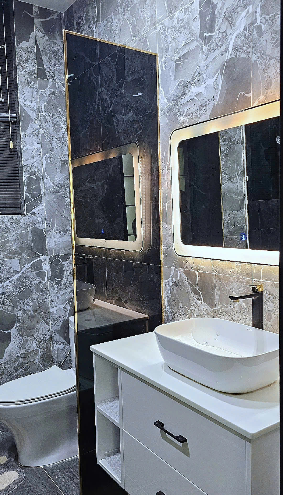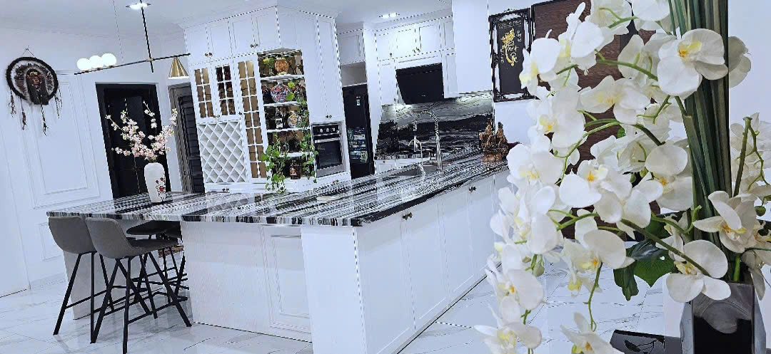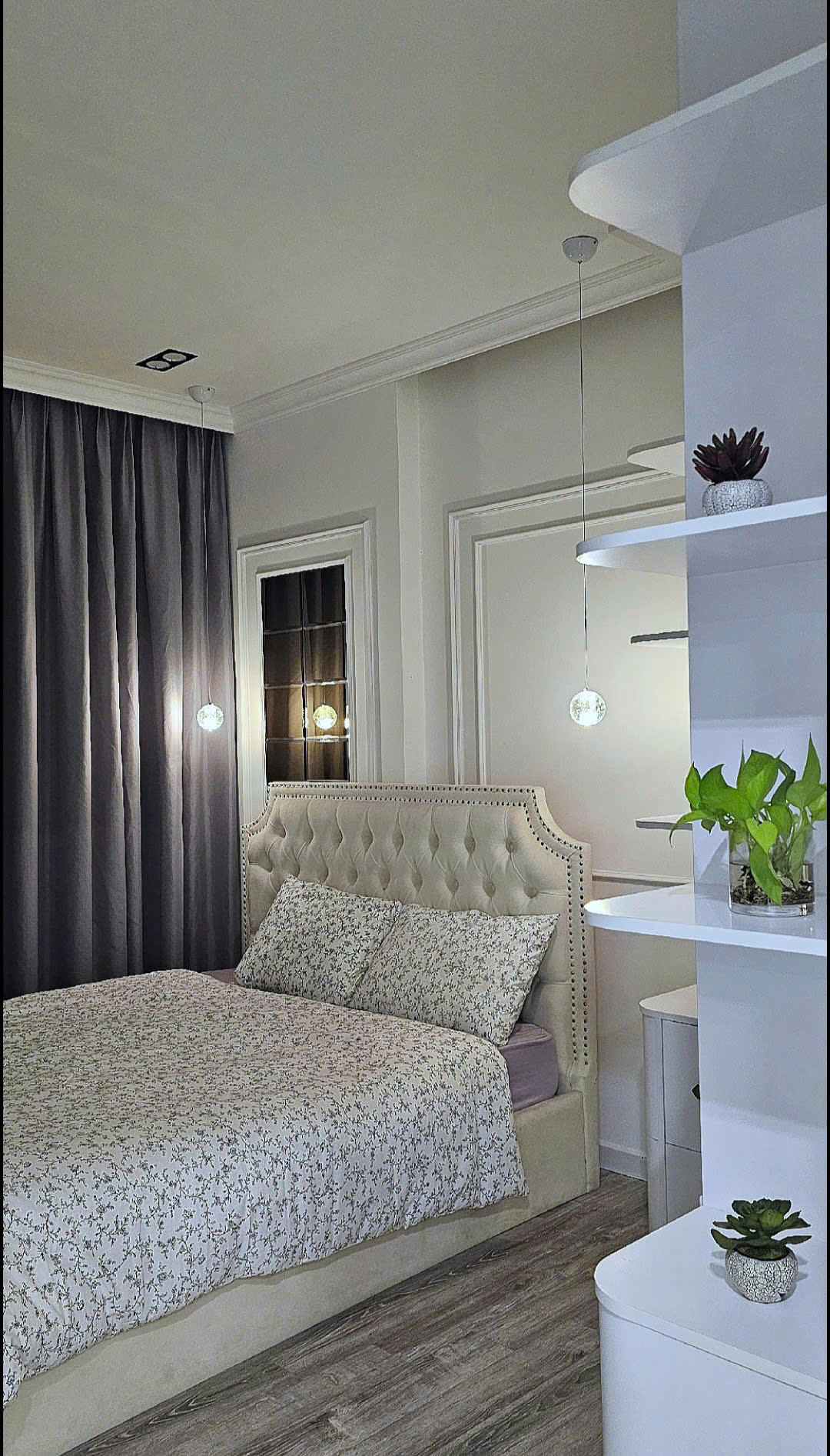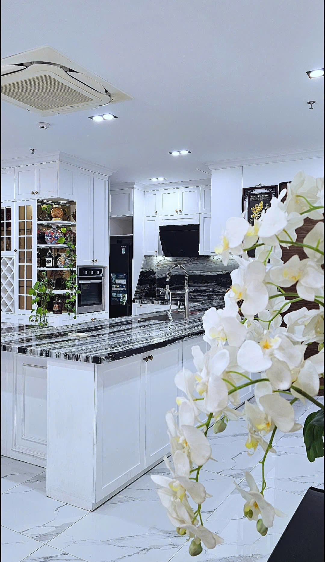 Khu bếp được thiết kế liền mạch với phòng ăn, trang bị đầy đủ nội thất và thiết bị hiện đại, tủ bếp lớn, mặt đá cao cấp, tiện nghi cho sinh hoạt hằng ngày. Nội thất tổng thể mang phong cách thanh lịch, ấm cúng nhưng vẫn sang trọng, phù hợp với nhiều đối tượng khách thuê.