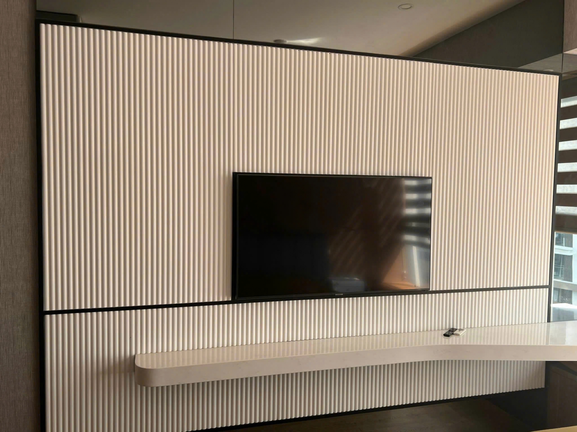 Với diện tích 82m², căn hộ được thiết kế gồm 2 phòng ngủ với bố cục hợp lý, tối ưu công năng sử dụng. Phòng khách mang phong cách hiện đại với tông màu trung tính sang trọng, kết hợp hệ tủ tivi ốp gỗ và mặt đá tạo điểm nhấn nổi bật. Nội thất được lựa chọn đồng bộ, tinh tế, tạo cảm giác ấm cúng nhưng vẫn rất hiện đại.