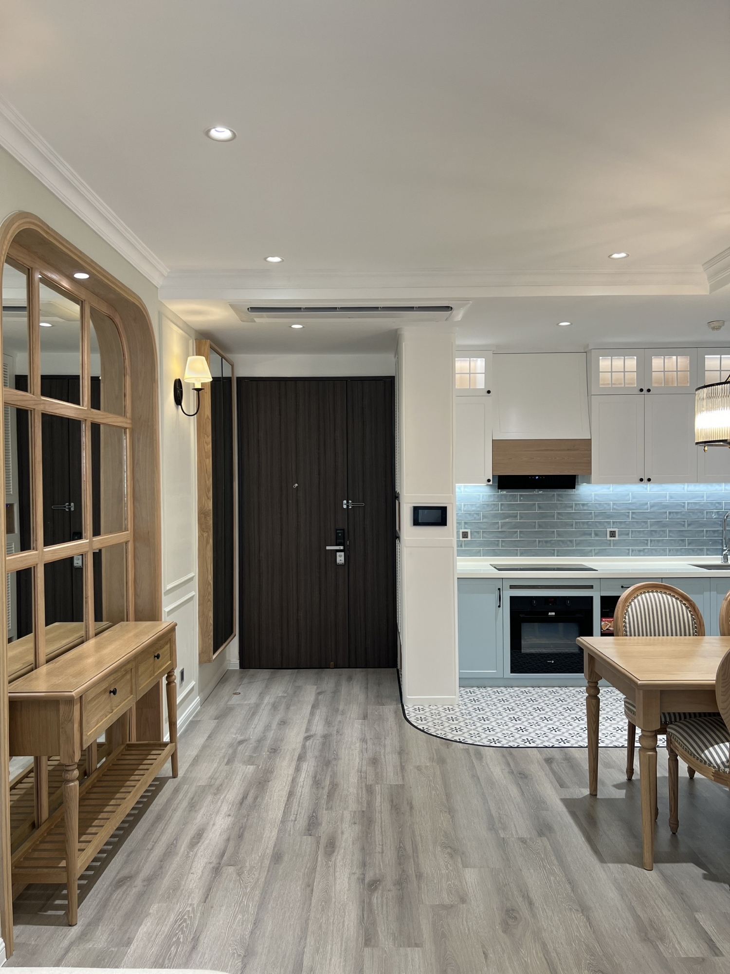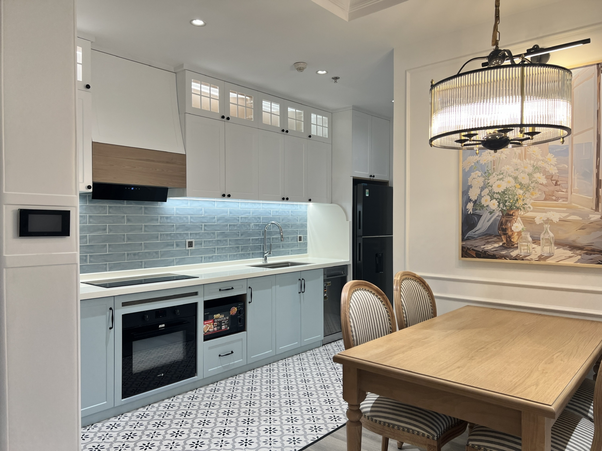 Khu bếp được thiết kế hiện đại, trang bị đầy đủ hệ tủ bếp, thiết bị điện và khu vực bàn ăn gọn gàng. Căn hộ đã được trang bị đầy đủ nội thất như sofa, bàn ăn, giường ngủ, tủ quần áo, máy lạnh, máy giặt và các thiết bị cần thiết khác, sẵn sàng cho khách thuê vào ở ngay.