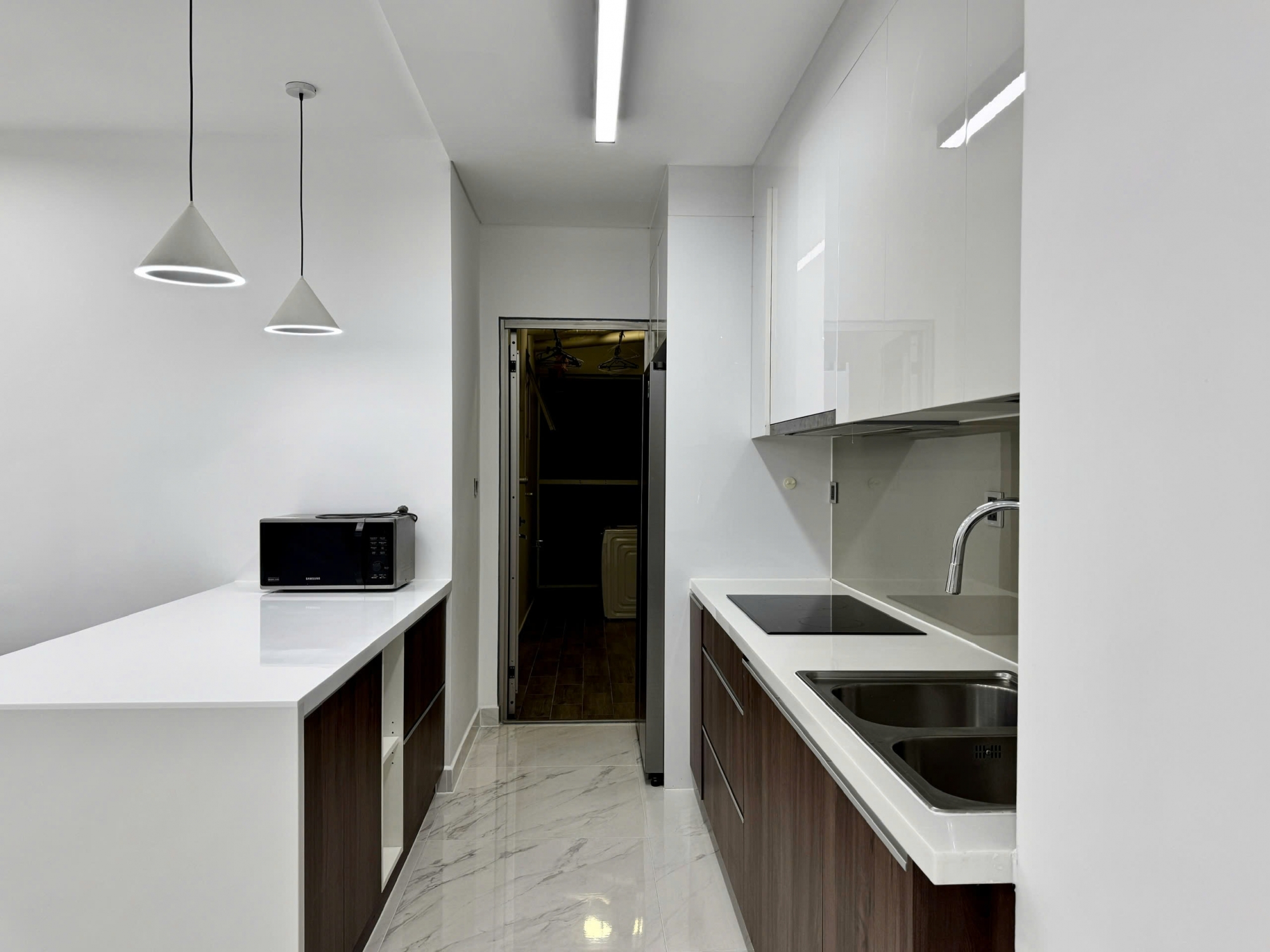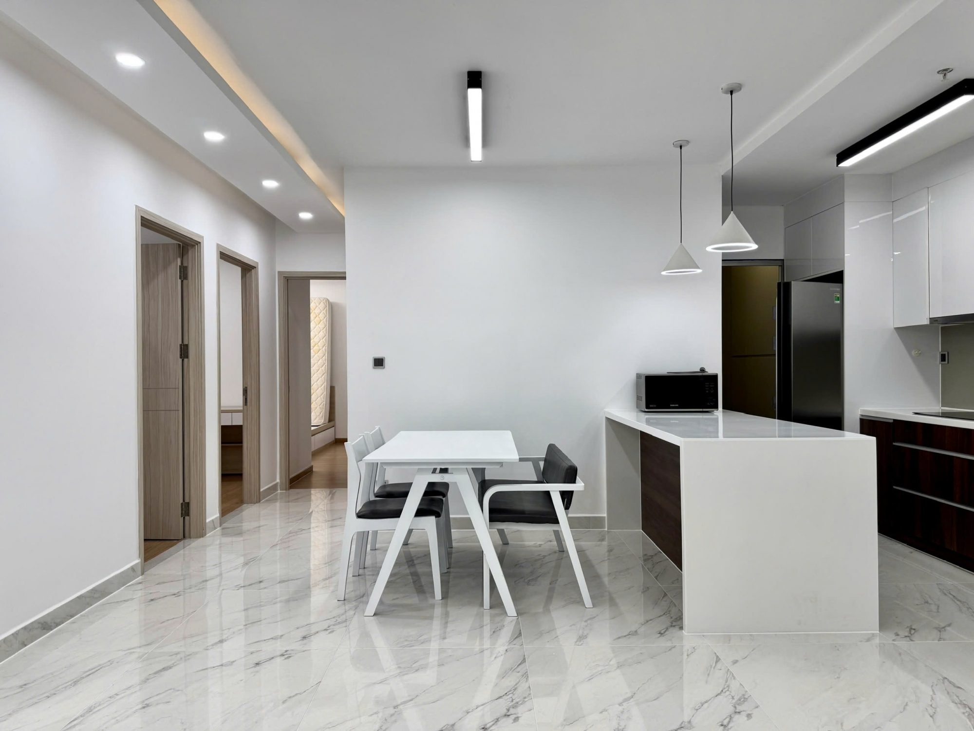 Khu bếp và bàn ăn được thiết kế gọn gàng, đầy đủ trang thiết bị cần thiết cho sinh hoạt hàng ngày. Ba phòng ngủ được bố trí hợp lý, nội thất đầy đủ, mang lại sự riêng tư và thoải mái cho từng thành viên trong gia đình.