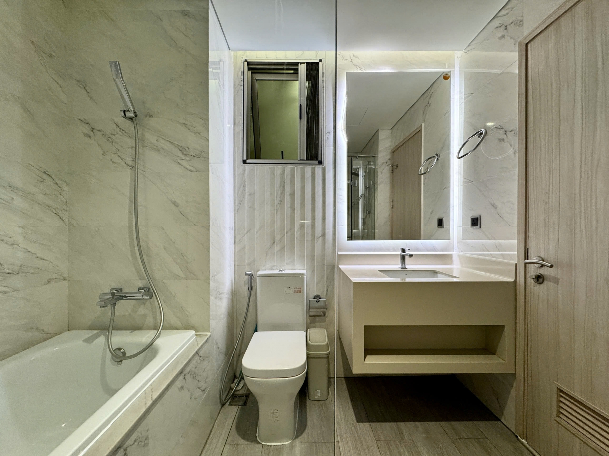 Căn hộ được thiết kế theo phong cách hiện đại với tông màu sáng, tối giản nhưng tinh tế. Phòng khách rộng rãi, bố trí sofa thoải mái, kết hợp cùng kệ tivi và hệ thống chiếu sáng âm trần, tạo nên không gian sinh hoạt ấm cúng và sang trọng. Cửa kính lớn giúp căn hộ luôn tràn ngập ánh sáng tự nhiên, mang lại cảm giác thông thoáng và dễ chịu.