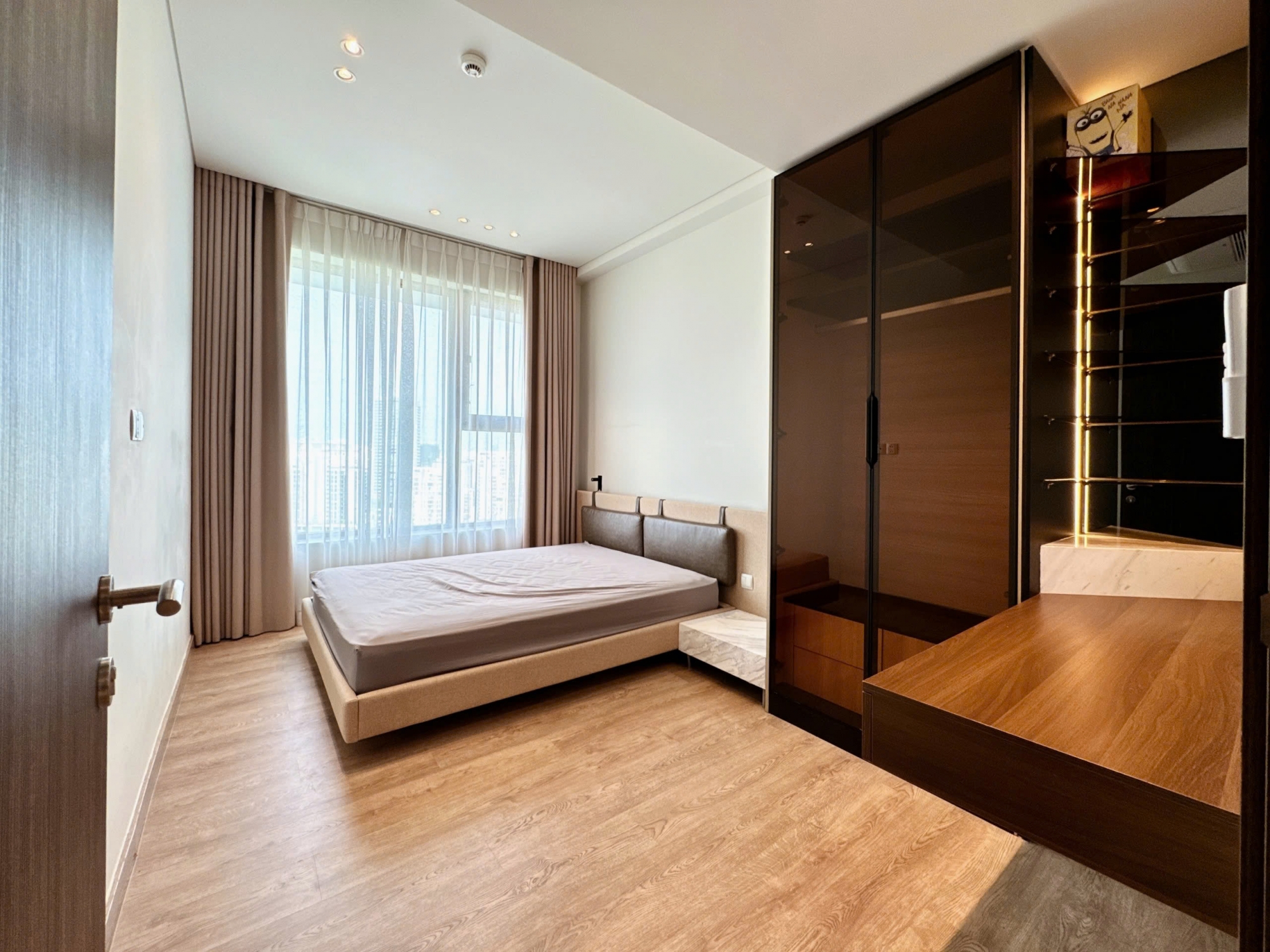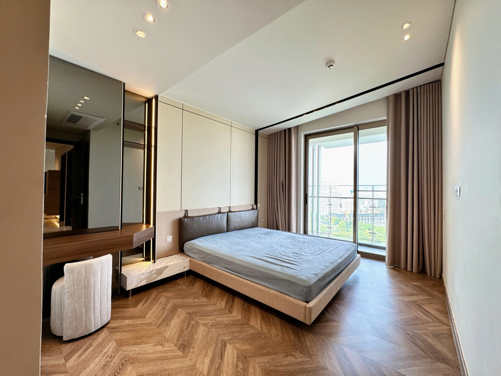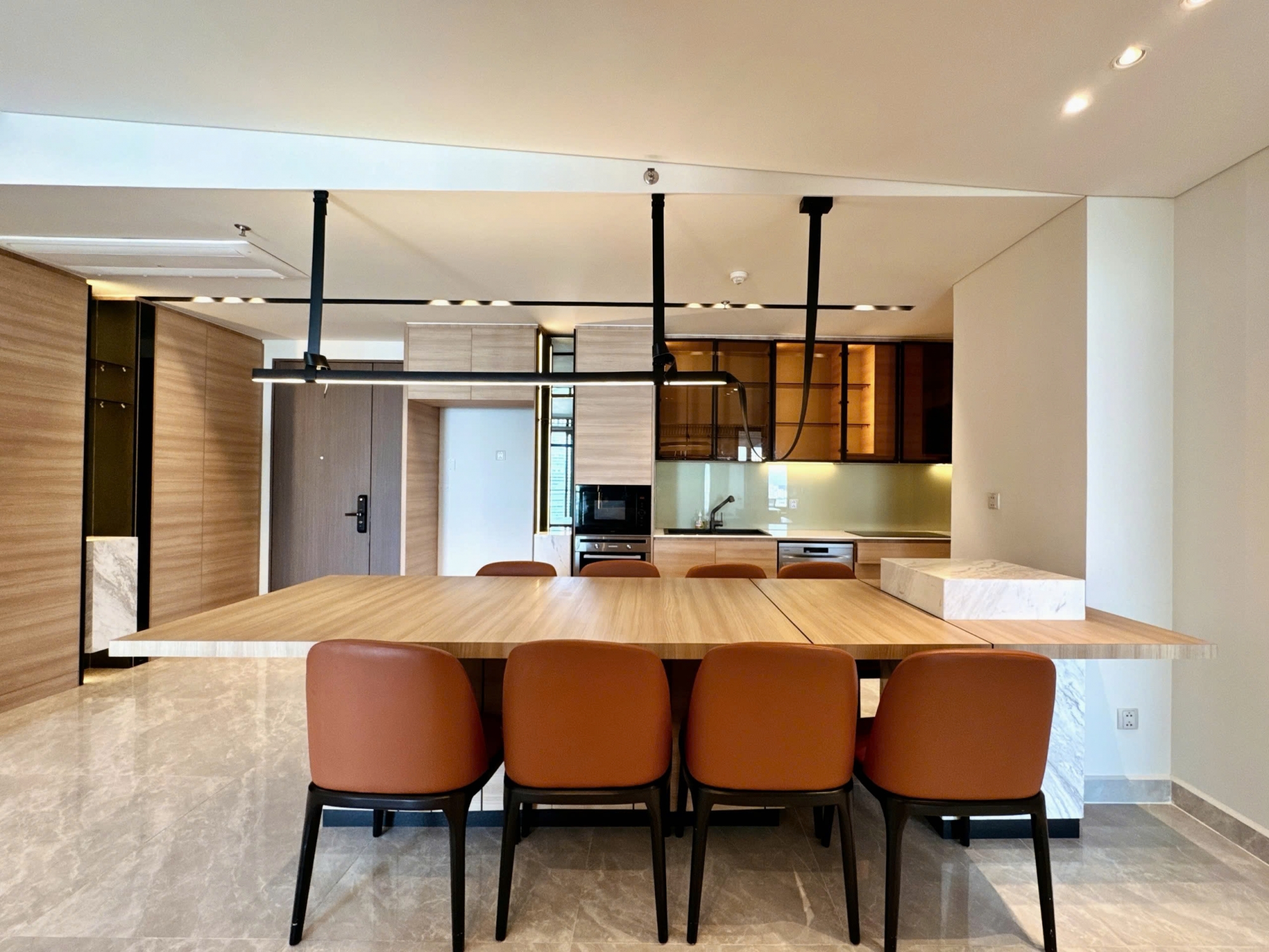 Căn hộ được thiết kế hiện đại với diện tích rộng rãi, bố trí 3 phòng ngủ, không gian phòng khách và bếp liên thông tạo cảm giác thoáng đãng và sang trọng. Toàn bộ nội thất được đầu tư cao cấp, đồng bộ theo phong cách tinh tế với gam màu trung tính, sàn đá bóng sang trọng và hệ tủ âm tường tối ưu công năng.
