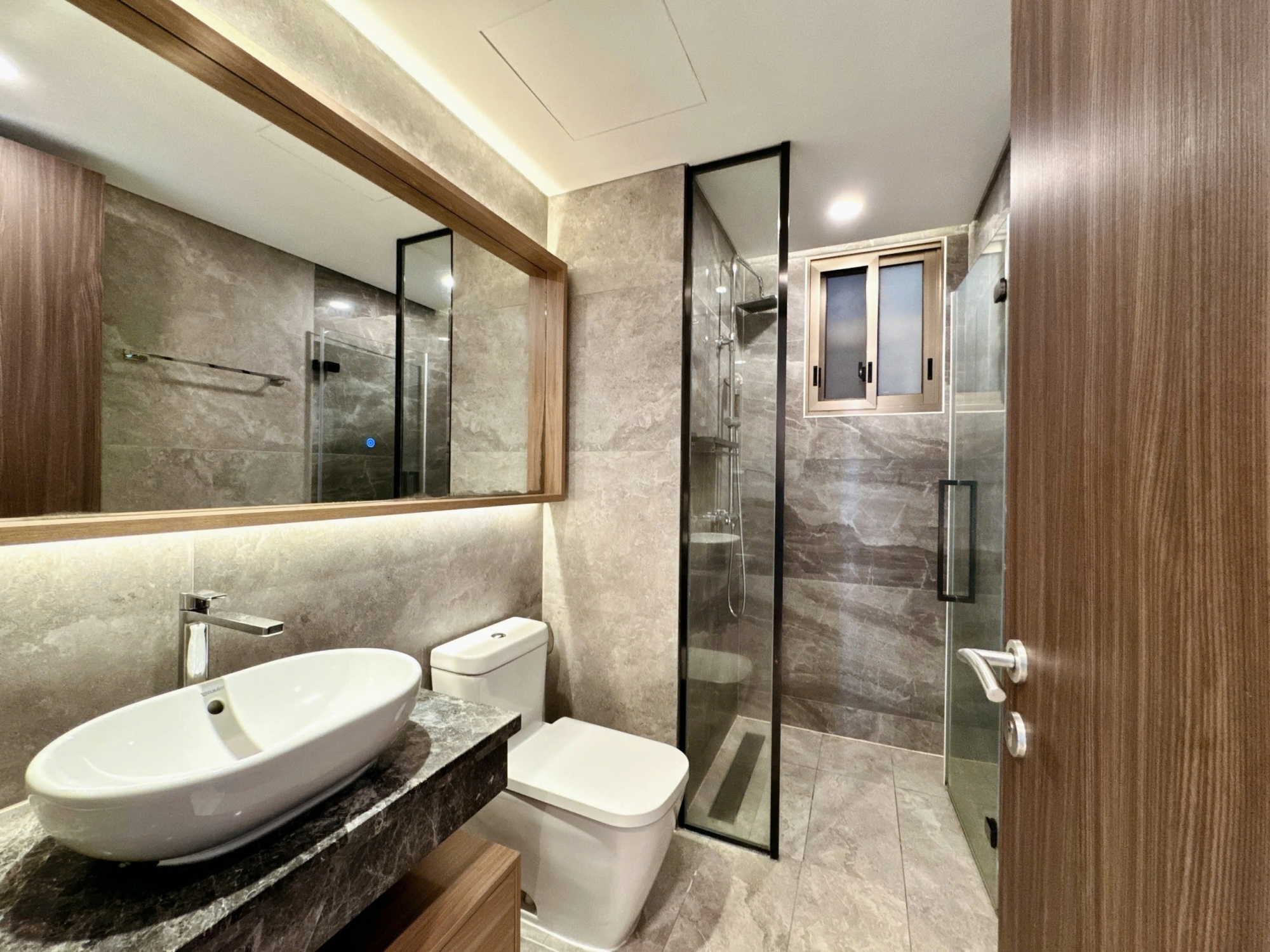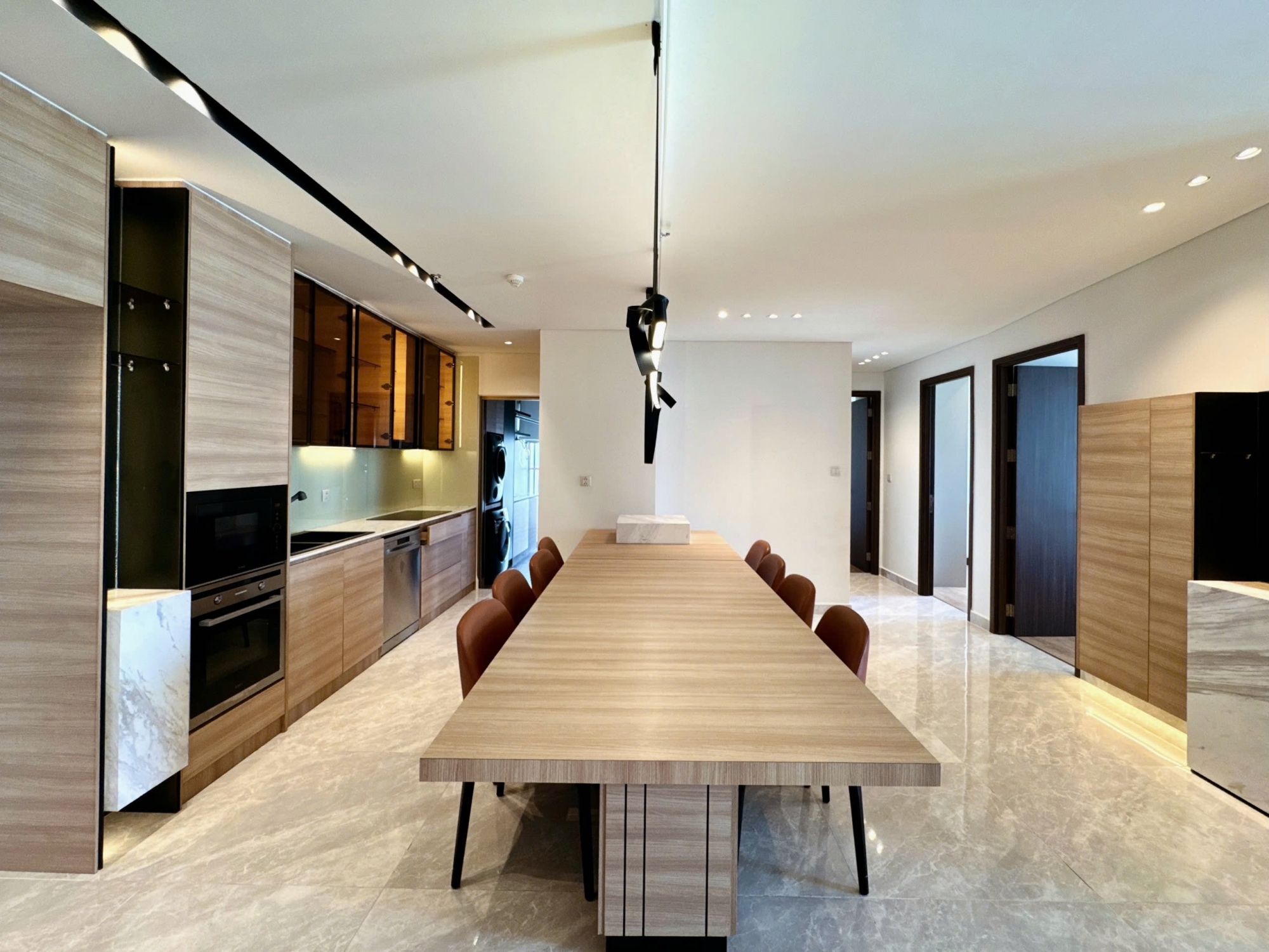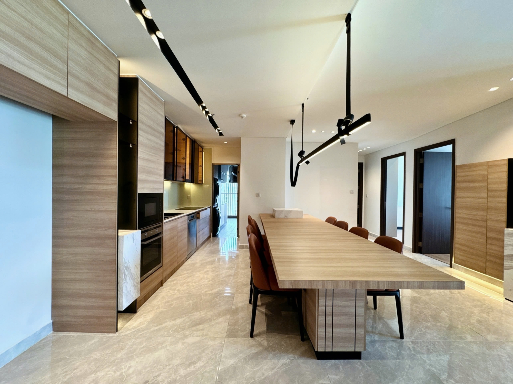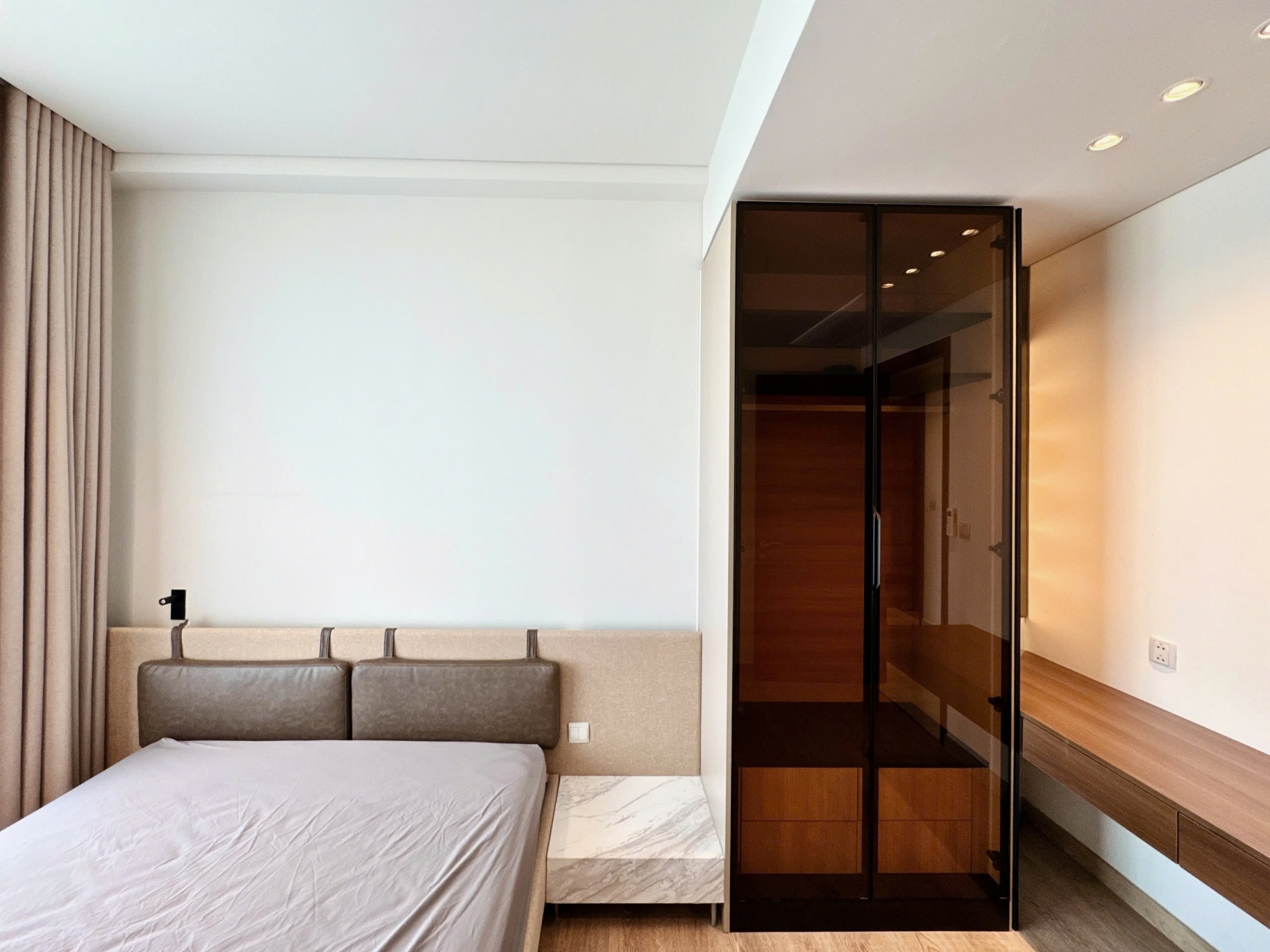 Căn hộ được thiết kế hiện đại với diện tích rộng rãi, bố trí 3 phòng ngủ, không gian phòng khách và bếp liên thông tạo cảm giác thoáng đãng và sang trọng. Toàn bộ nội thất được đầu tư cao cấp, đồng bộ theo phong cách tinh tế với gam màu trung tính, sàn đá bóng sang trọng và hệ tủ âm tường tối ưu công năng.
