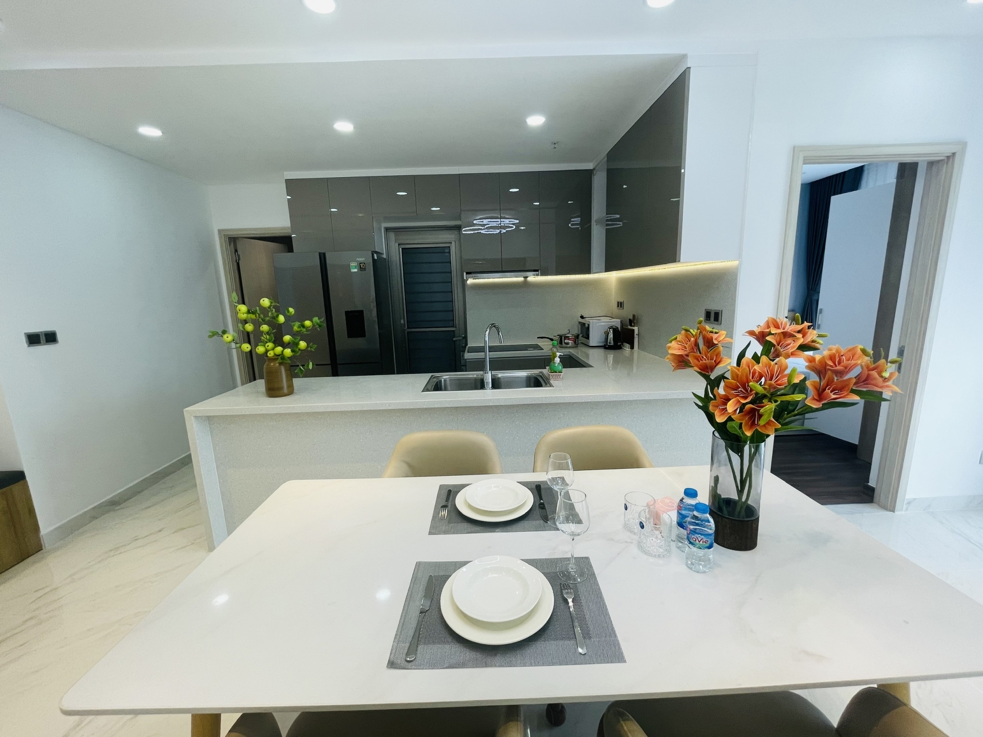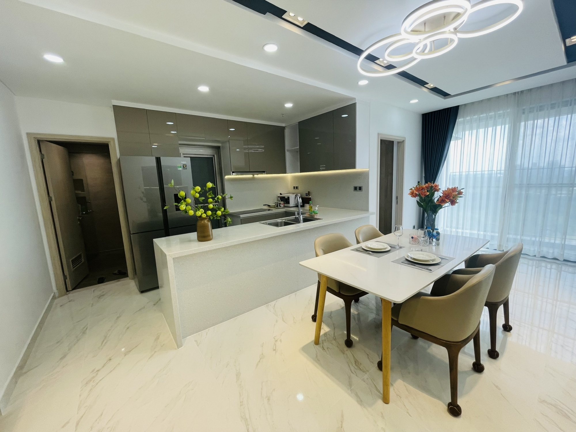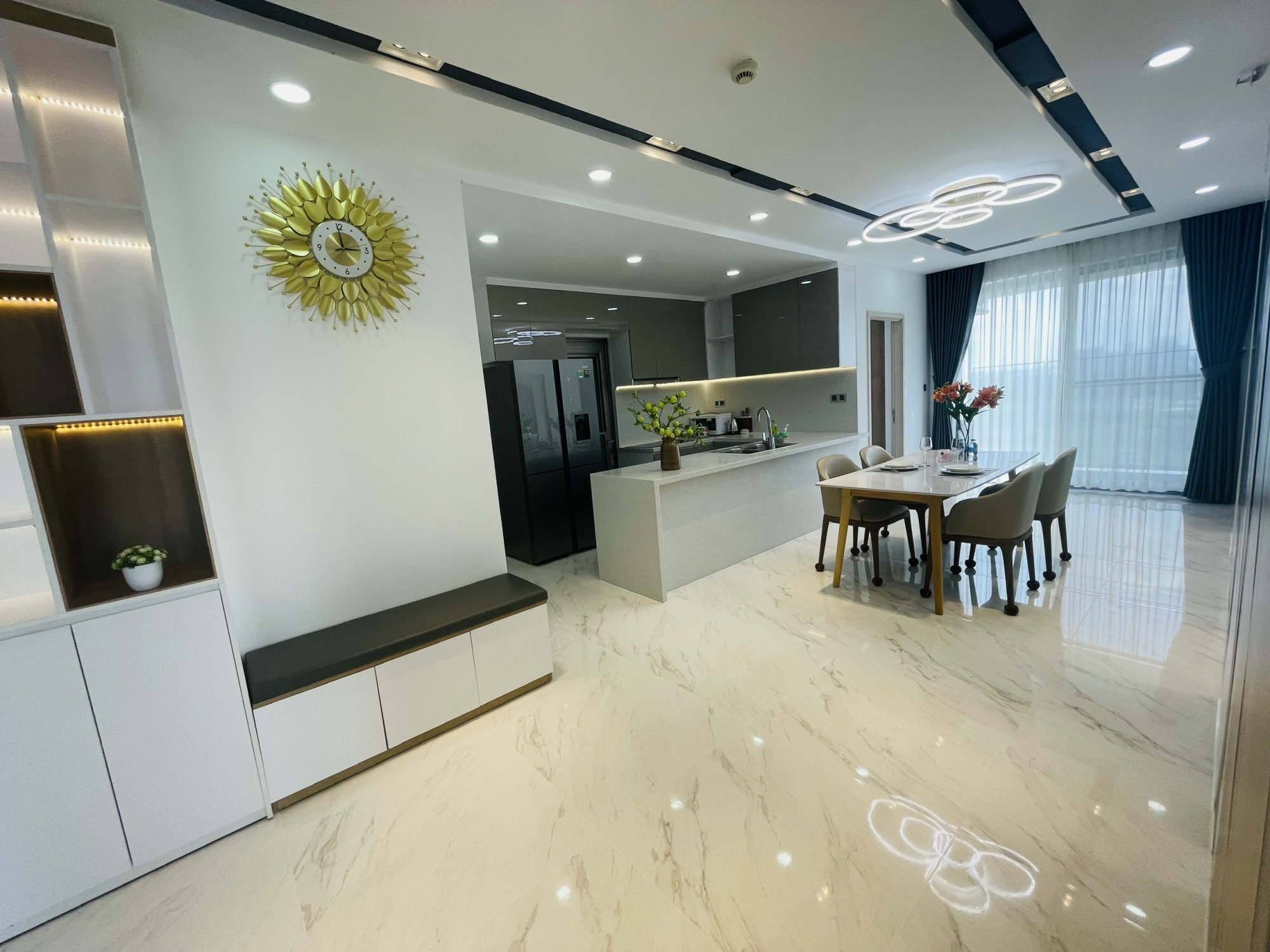 Với diện tích 135m², căn hộ sở hữu thiết kế rộng rãi và tối ưu công năng. Phòng khách bố trí thoáng đãng, liên thông khu vực bàn ăn và bếp mở, tạo cảm giác liền mạch và sang trọng. Hệ cửa kính lớn kéo dài giúp không gian luôn tràn ngập ánh sáng tự nhiên và đón gió mát từ sông.